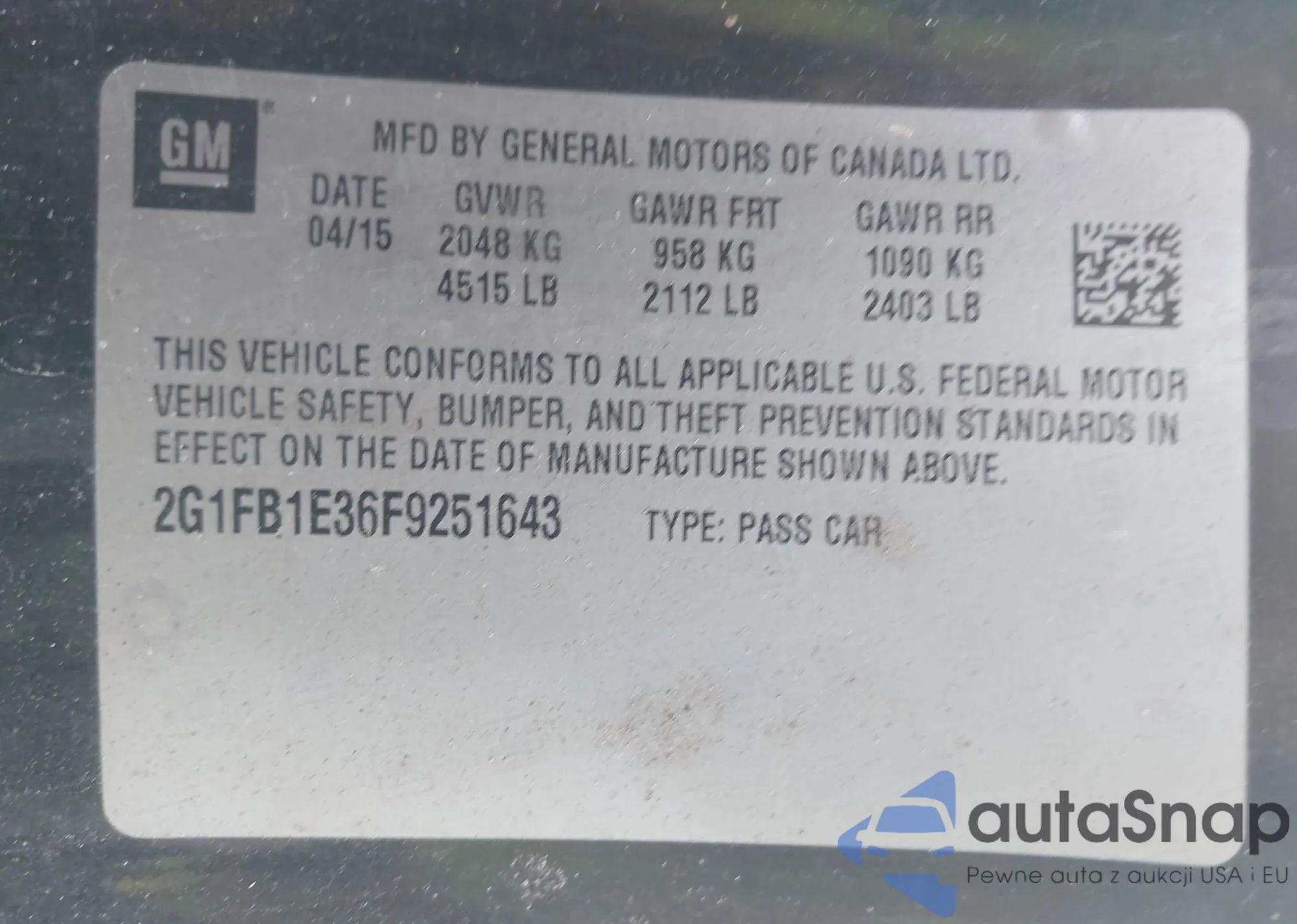 LOT: 42262739 VIN: 2G1FB1E36F9251643