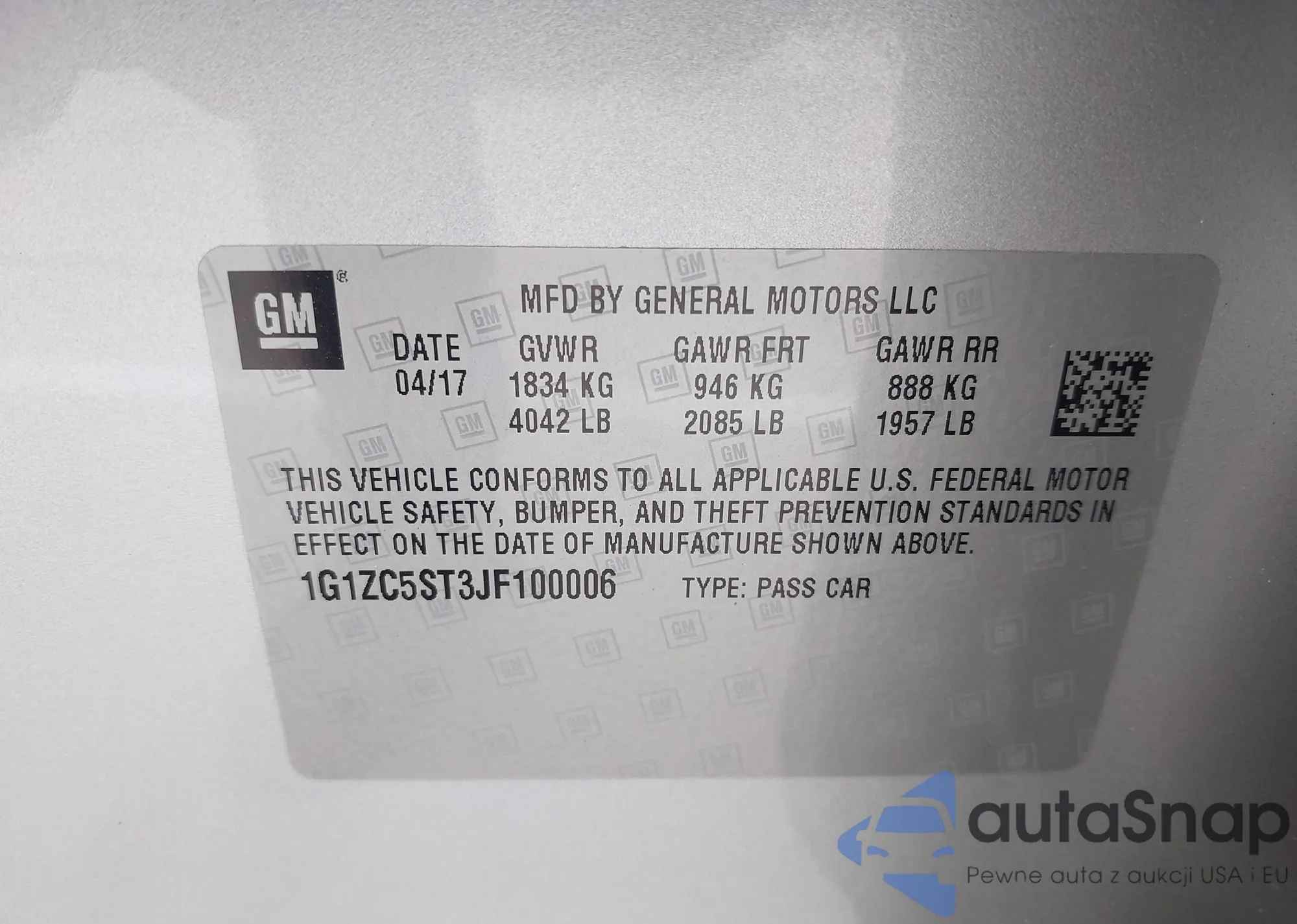 LOT: 42396417 VIN: 1G1ZC5ST3JF100006