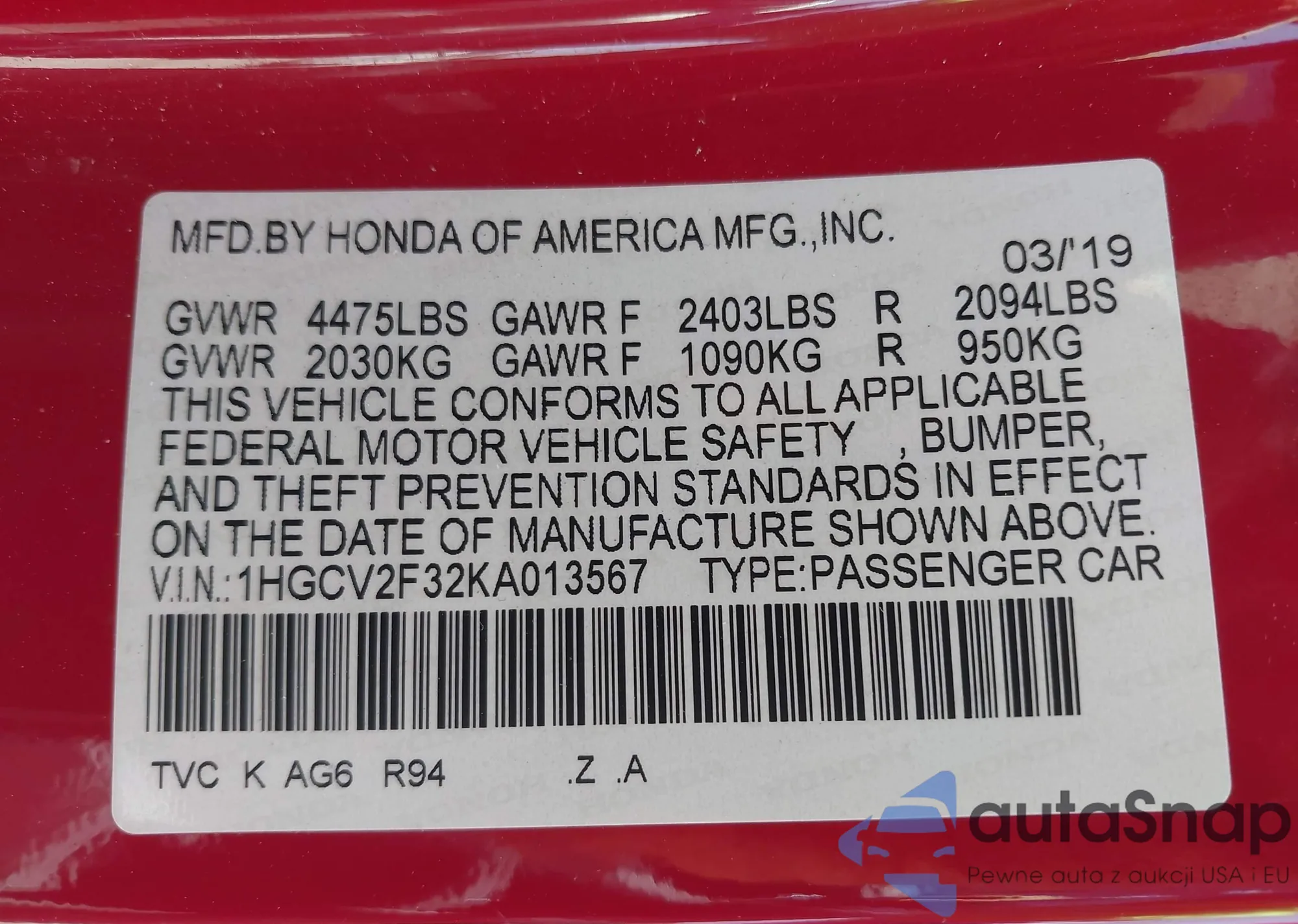 LOT: 42493535 VIN: 1HGCV2F32KA013567