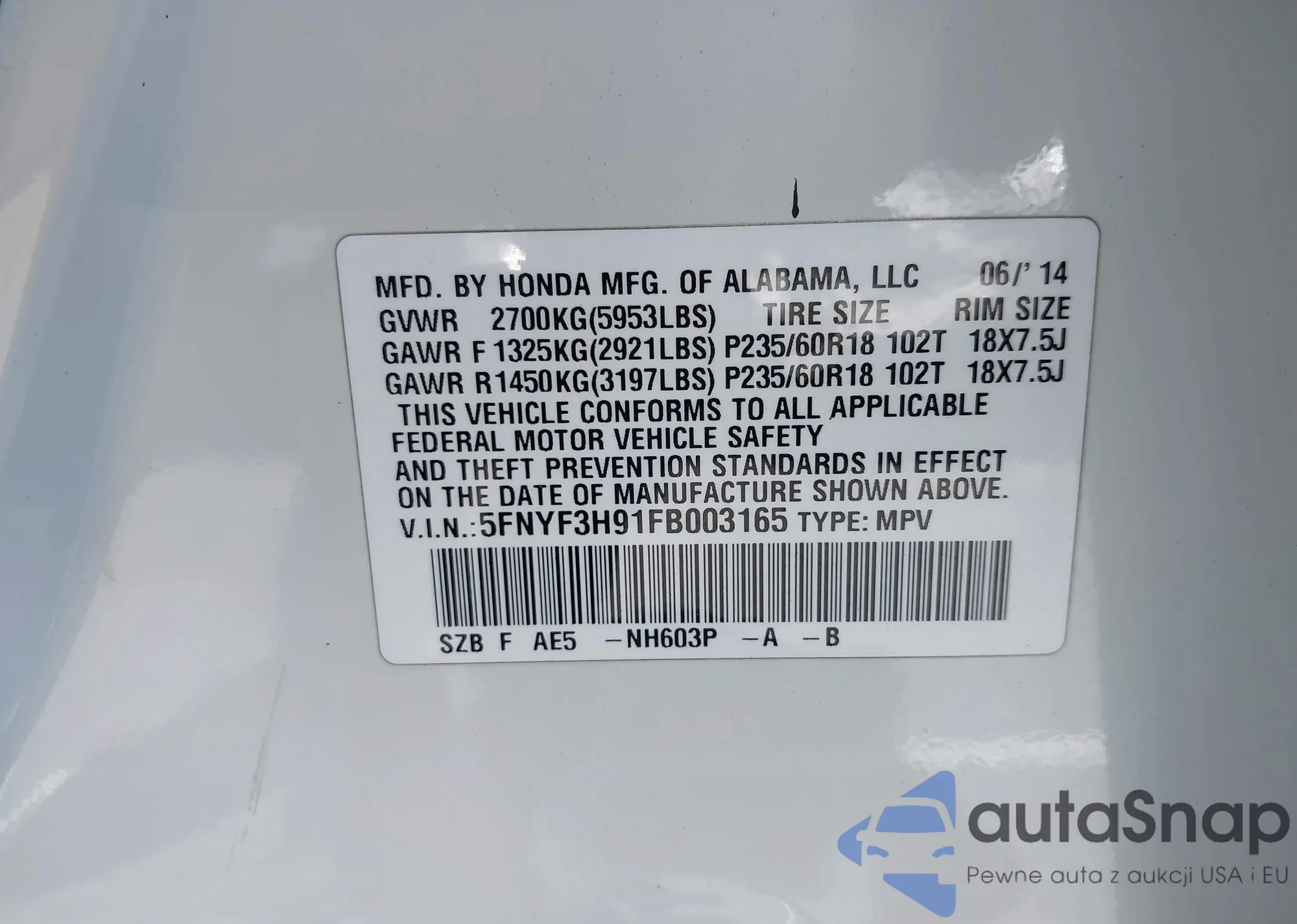 • VIN 5FNYF3H91FB003165