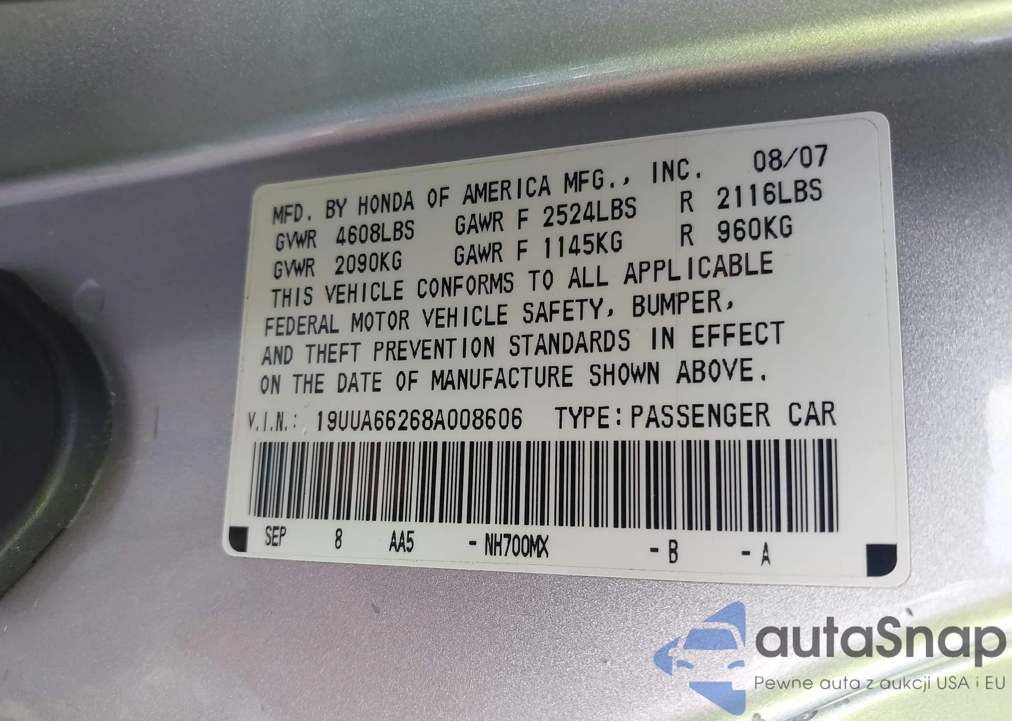 • VIN 19UUA66268A008606
