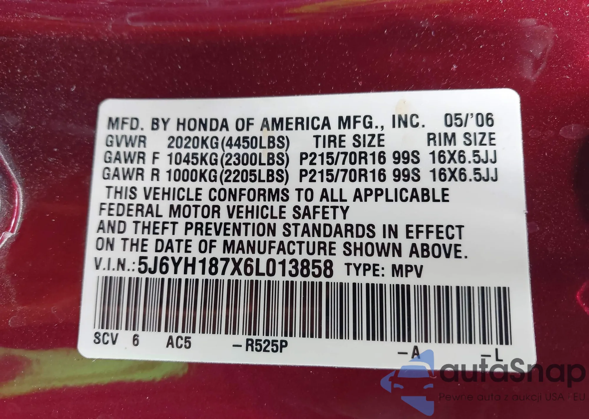 • VIN 5FNYF6H95MB091006