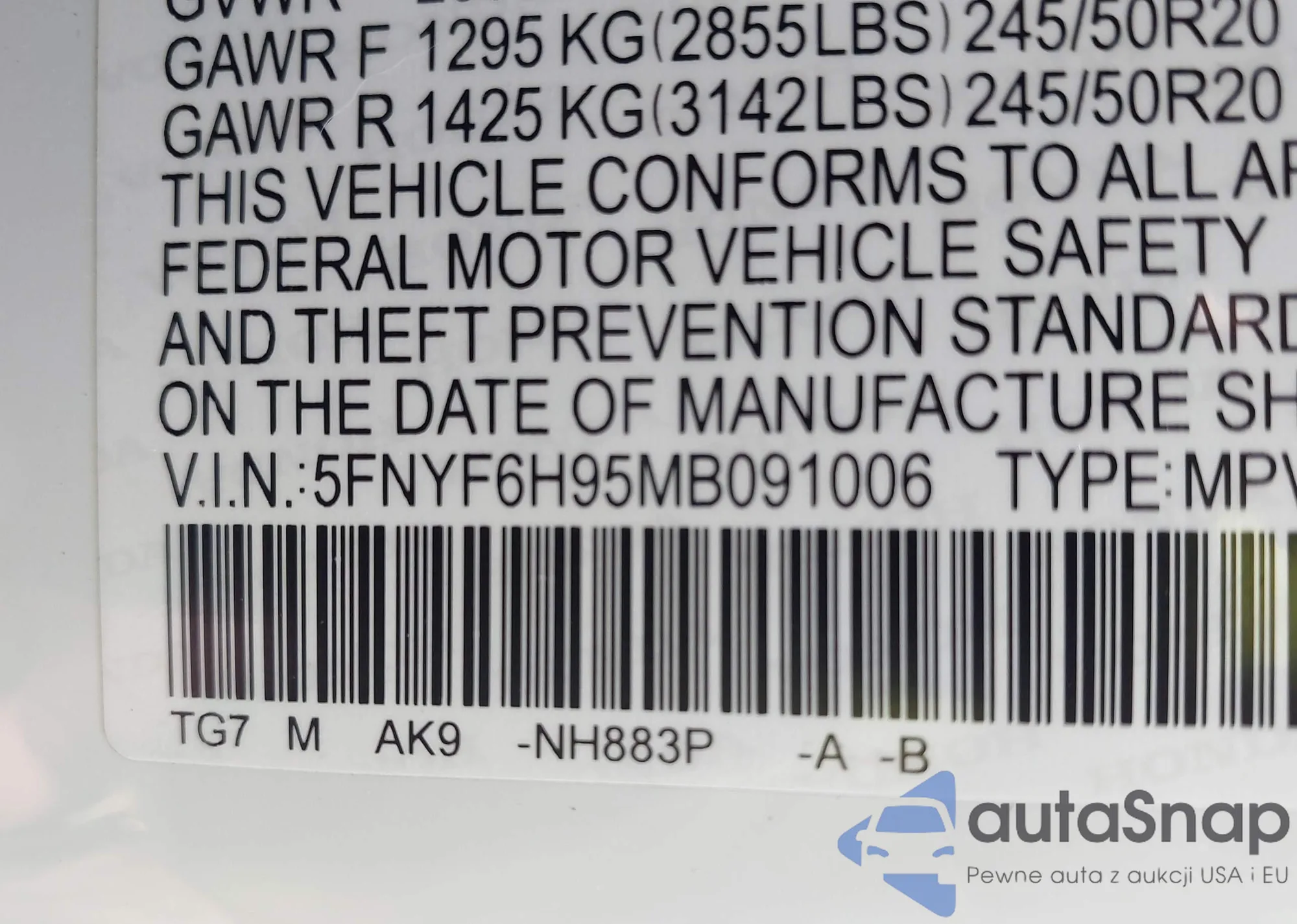 LOT: 42509101 VIN: 5FNYF6H95MB091006