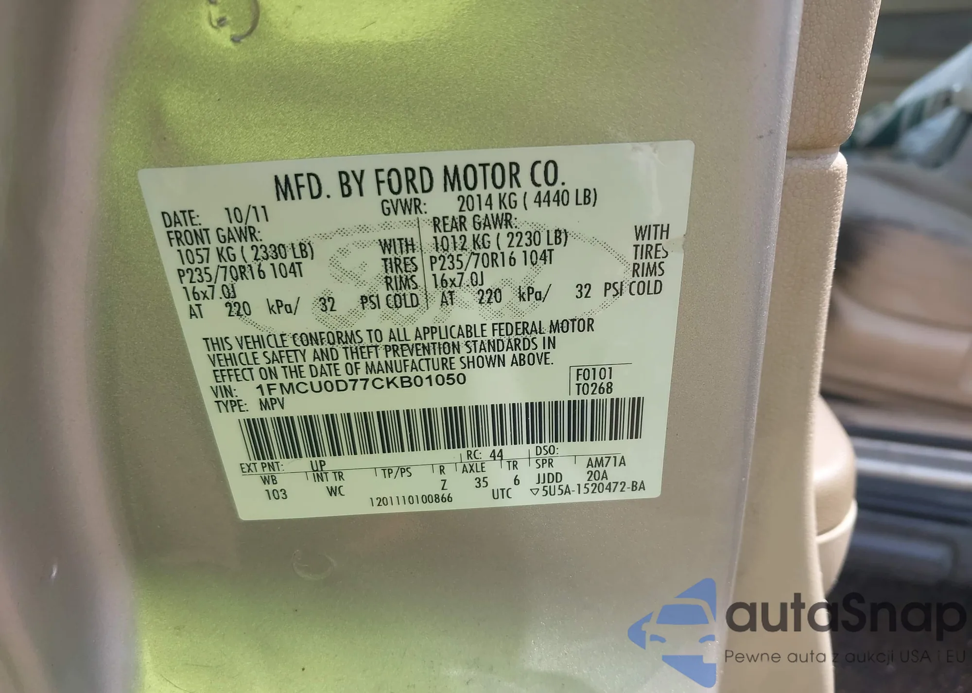 • VIN 1FMCU0D77CKB01050