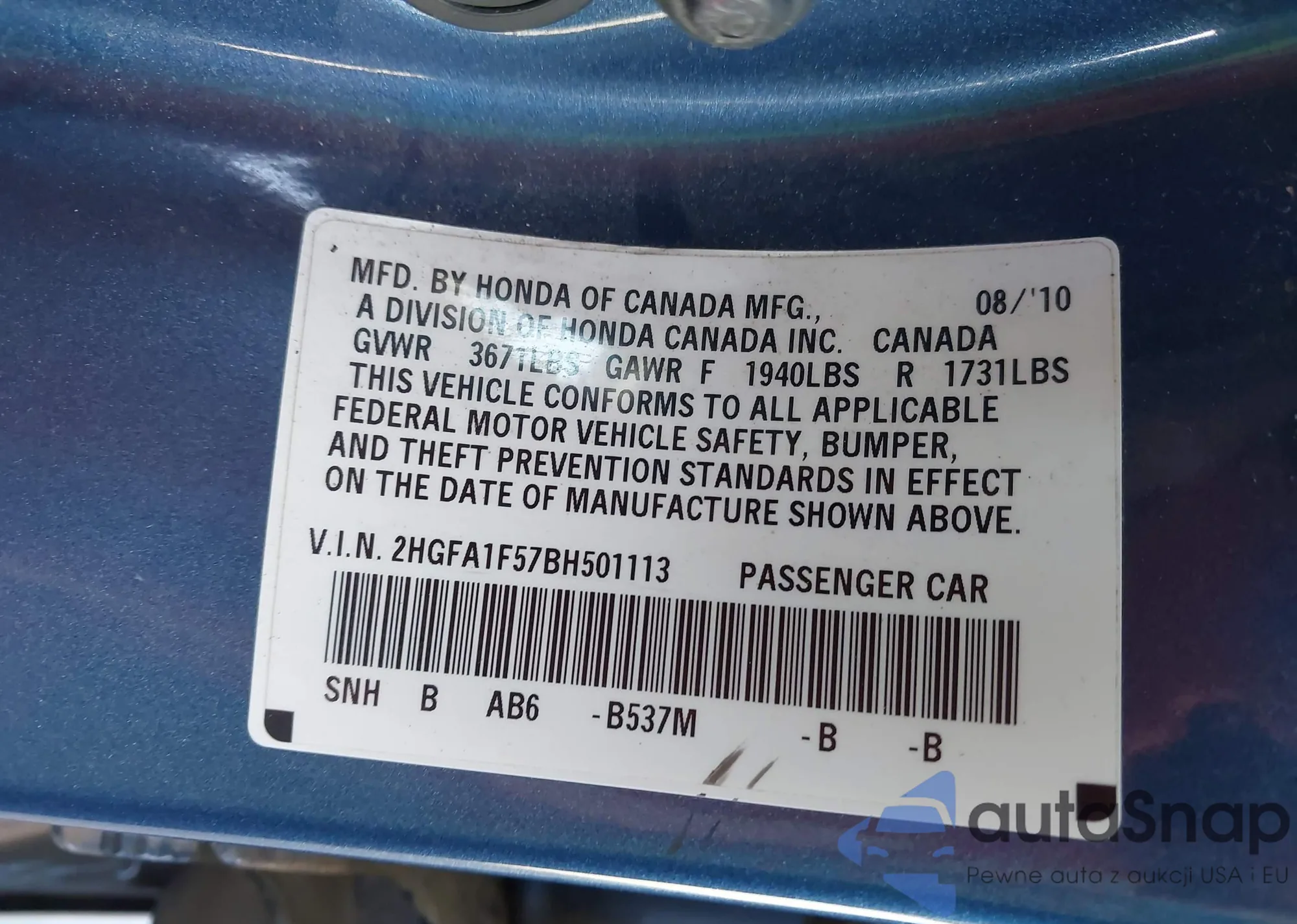 • VIN 2HGFA1F57BH501113