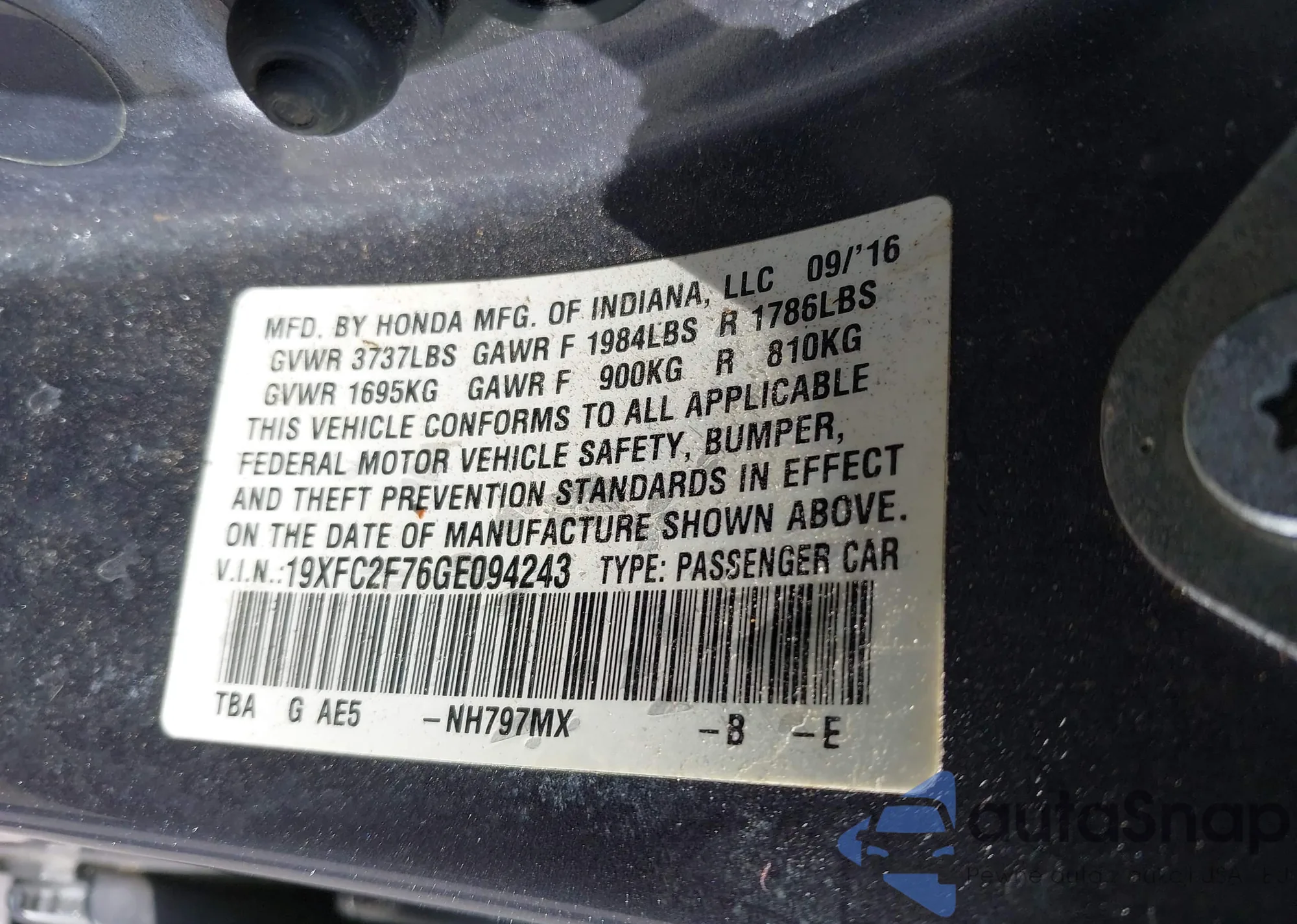 LOT: 42149634 VIN: 19XFC2F76GE094243
