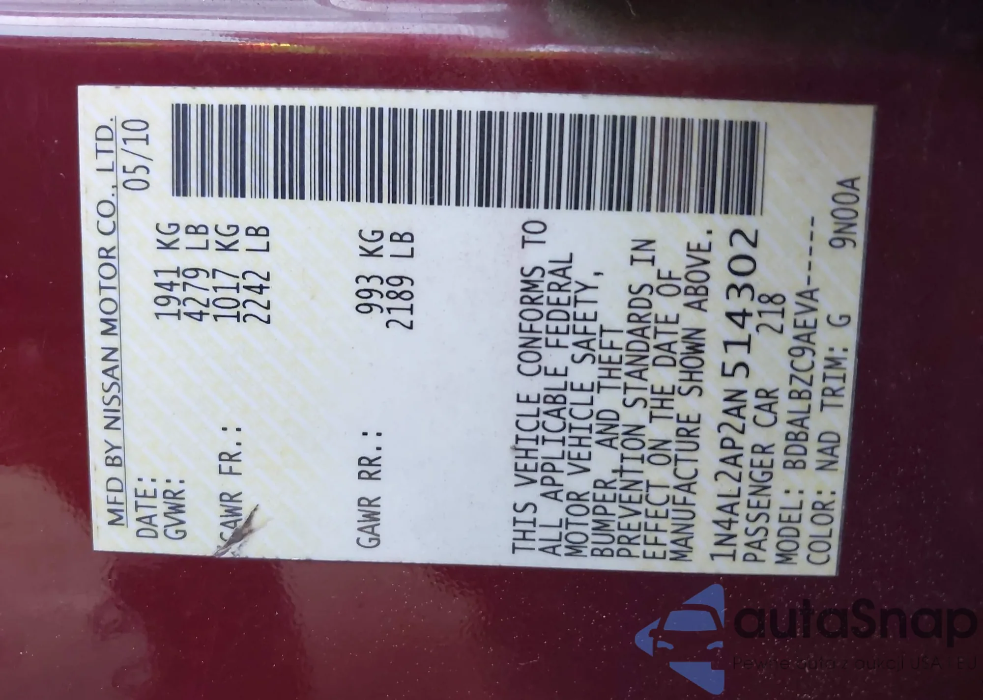 • VIN 1N4AL2AP2AN514302