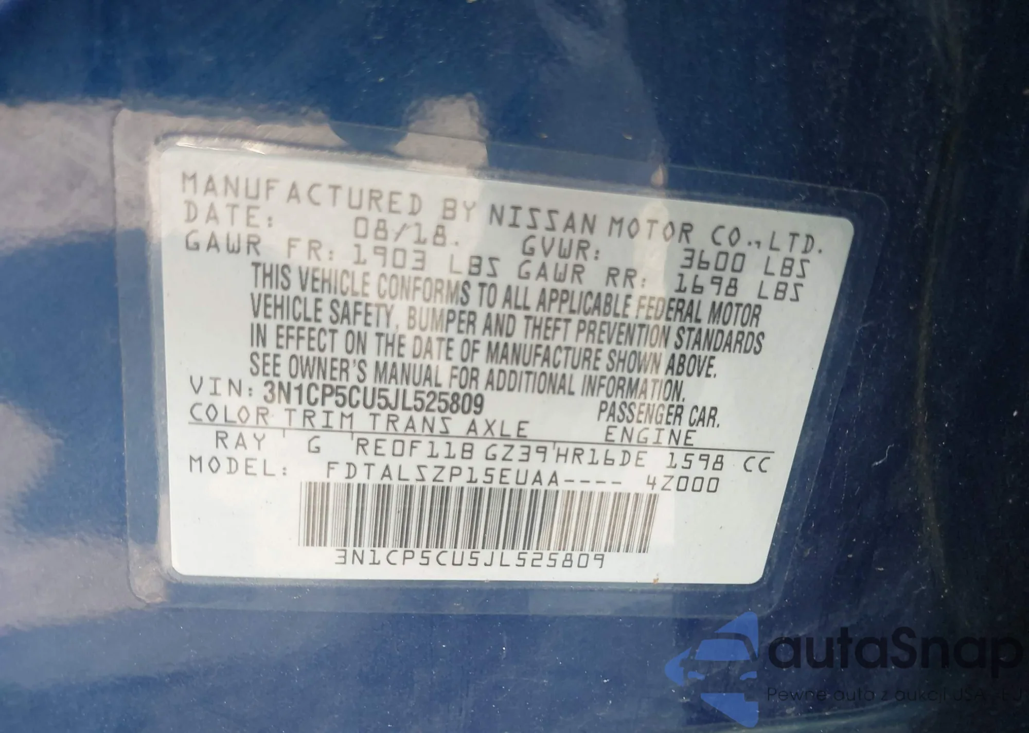 LOT: 42609583 VIN: 3N1CP5CU5JL525809