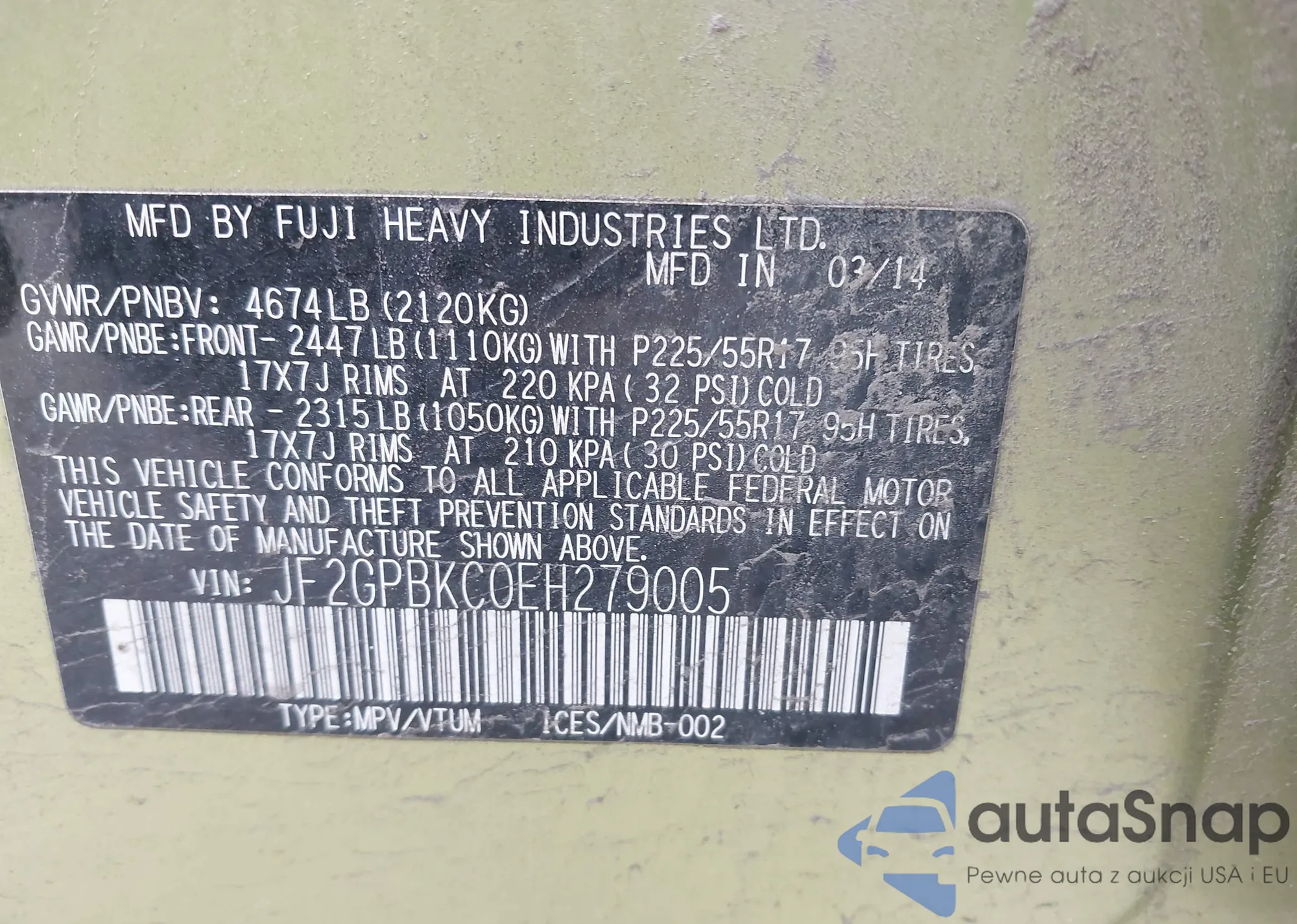 LOT: 42286421 VIN: JF2GPBKC0EH279005