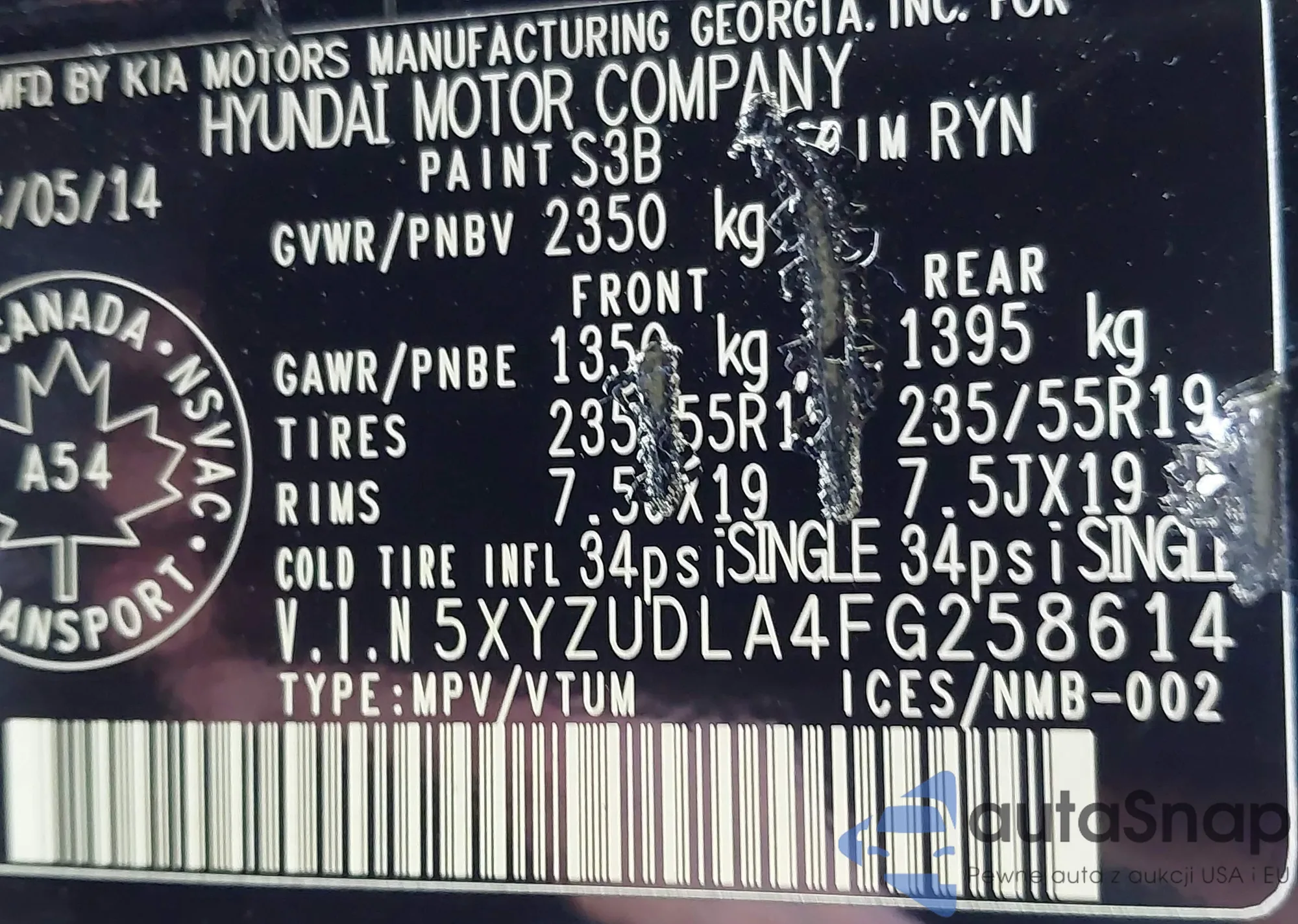 • VIN 5XYZUDLA4FG258614