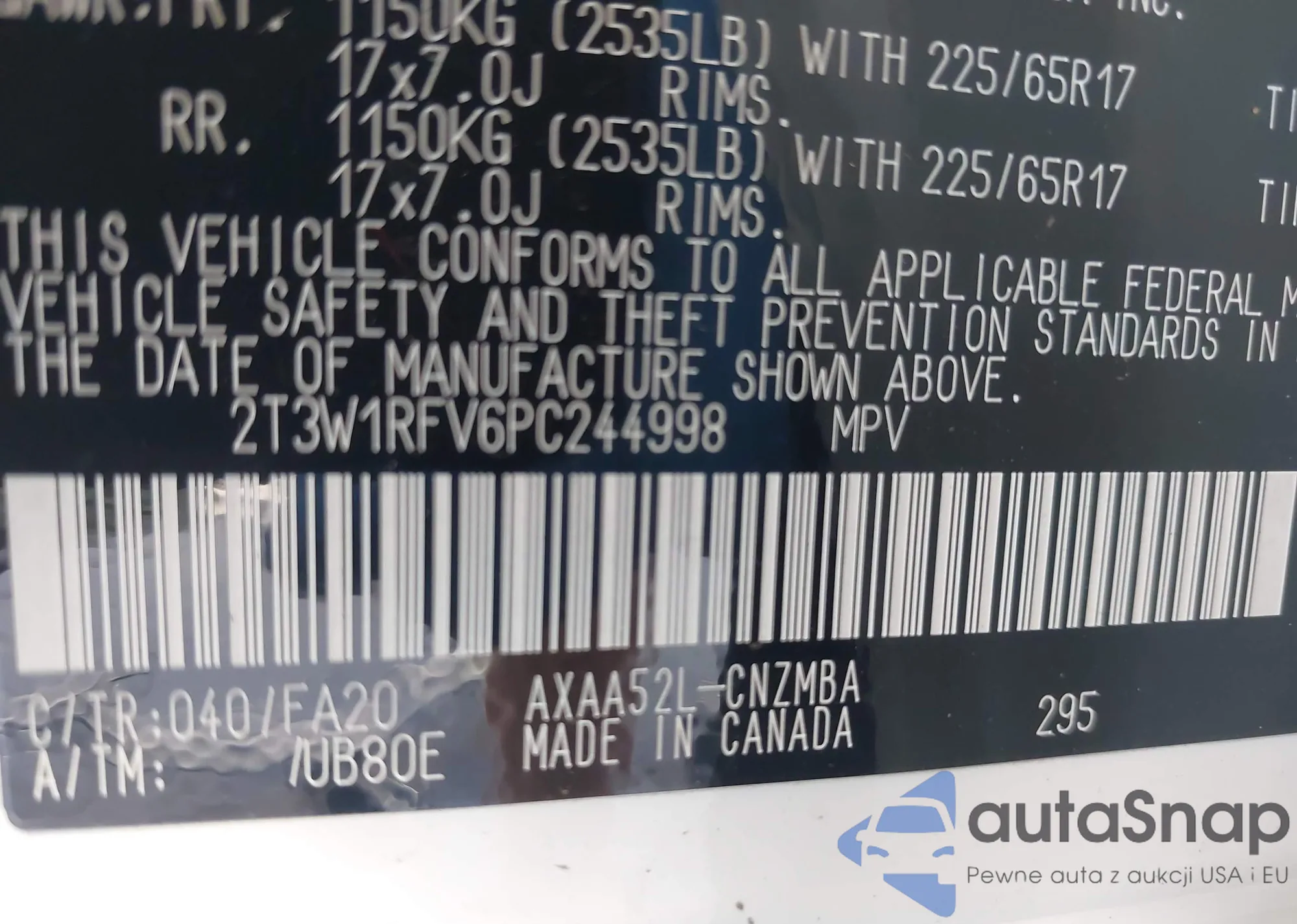 LOT: 39573153 VIN: 2T3W1RFV6PC244998