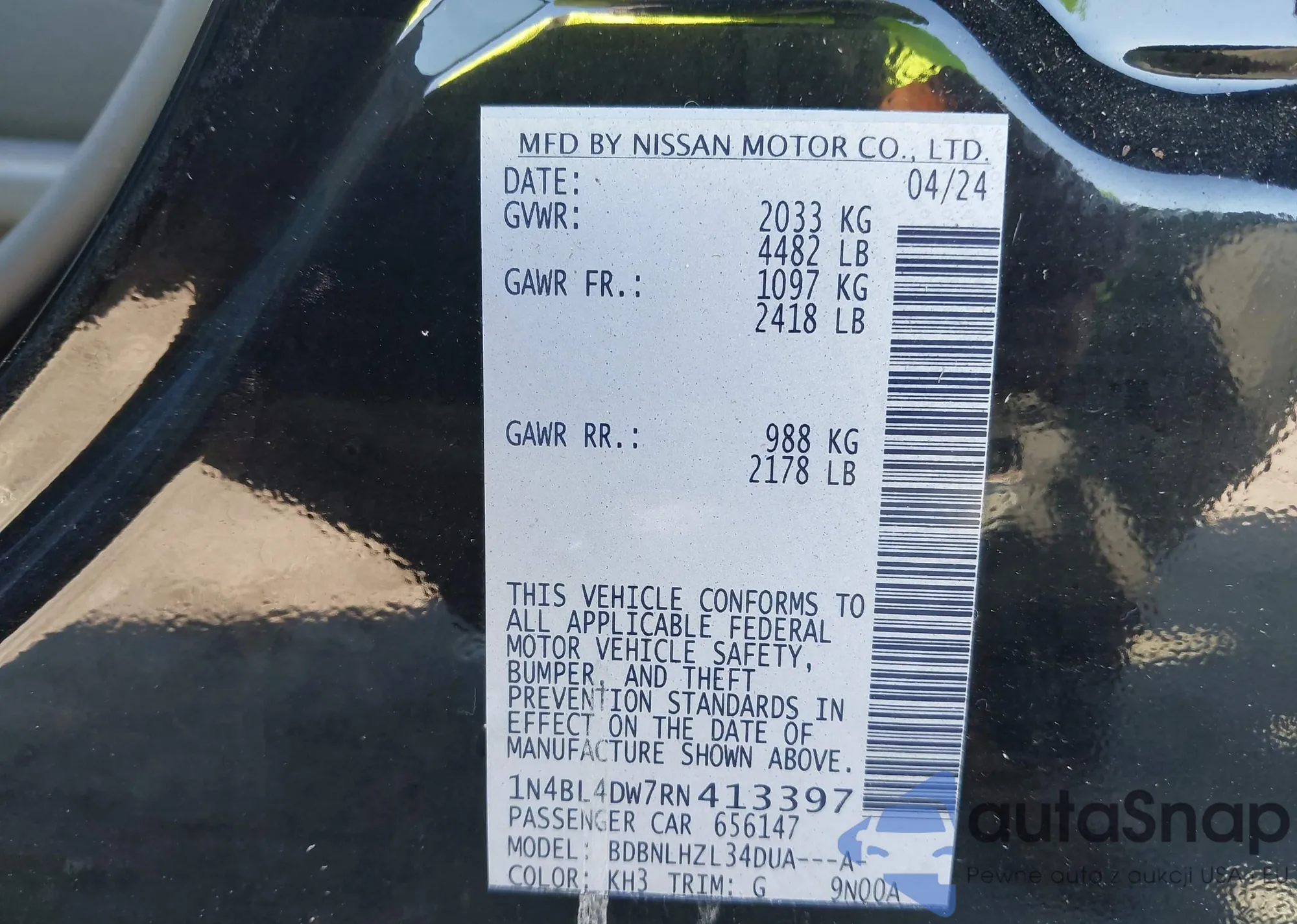 LOT: 40957392 VIN: 1N4BL4DW7RN413397