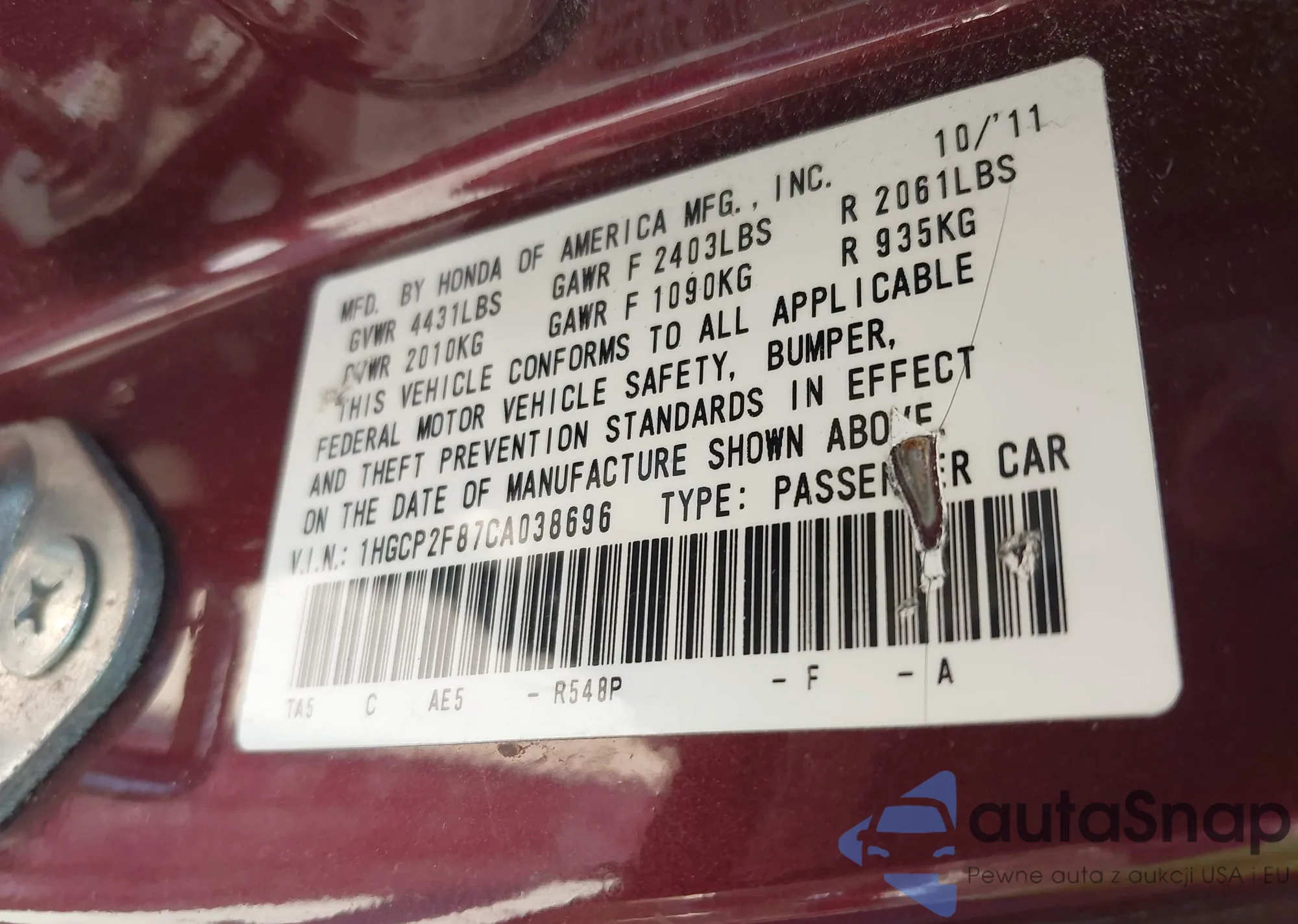 LOT: 42573350 VIN: 1HGCP2F87CA038696