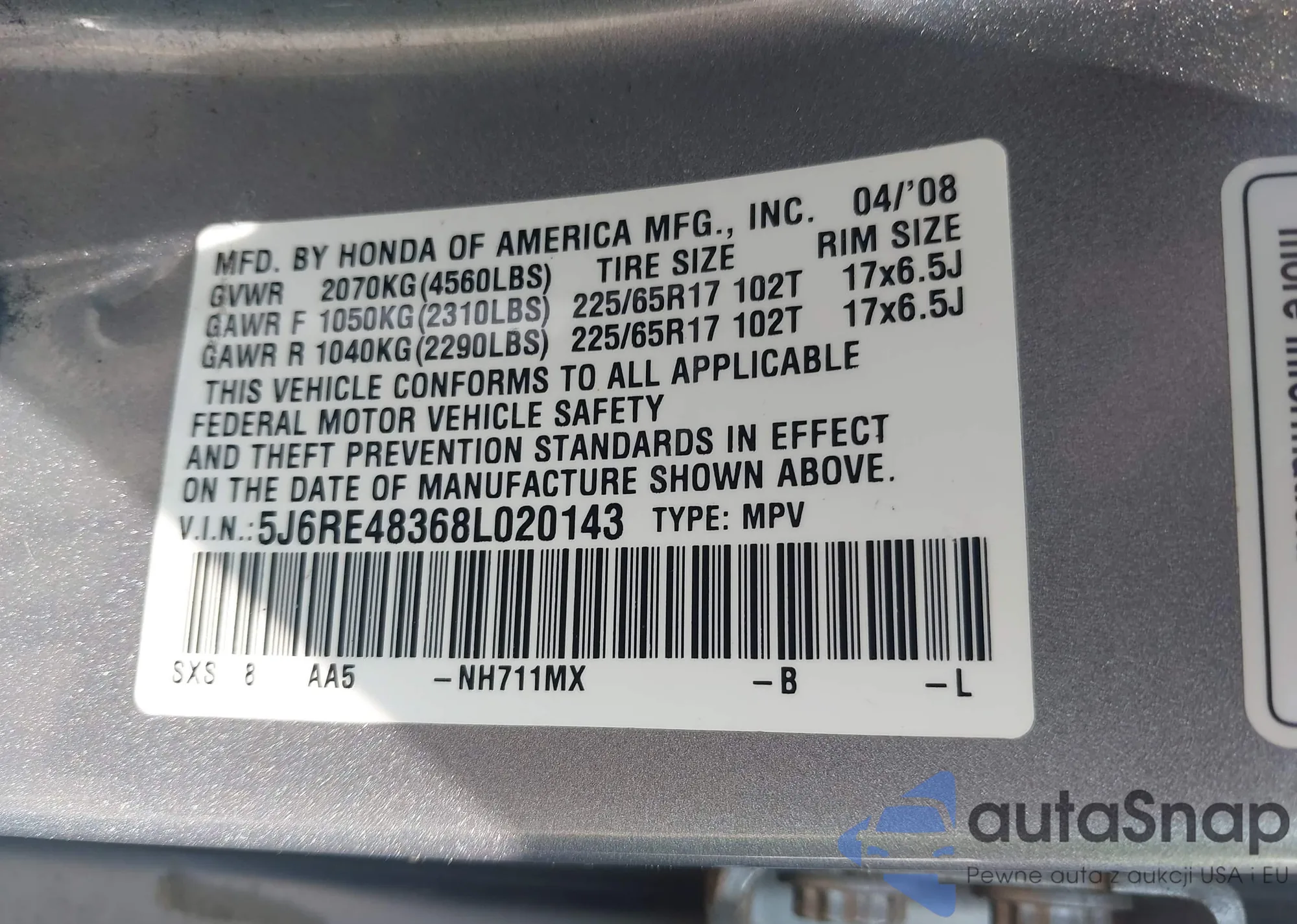 • VIN 5J6RE48368L020143