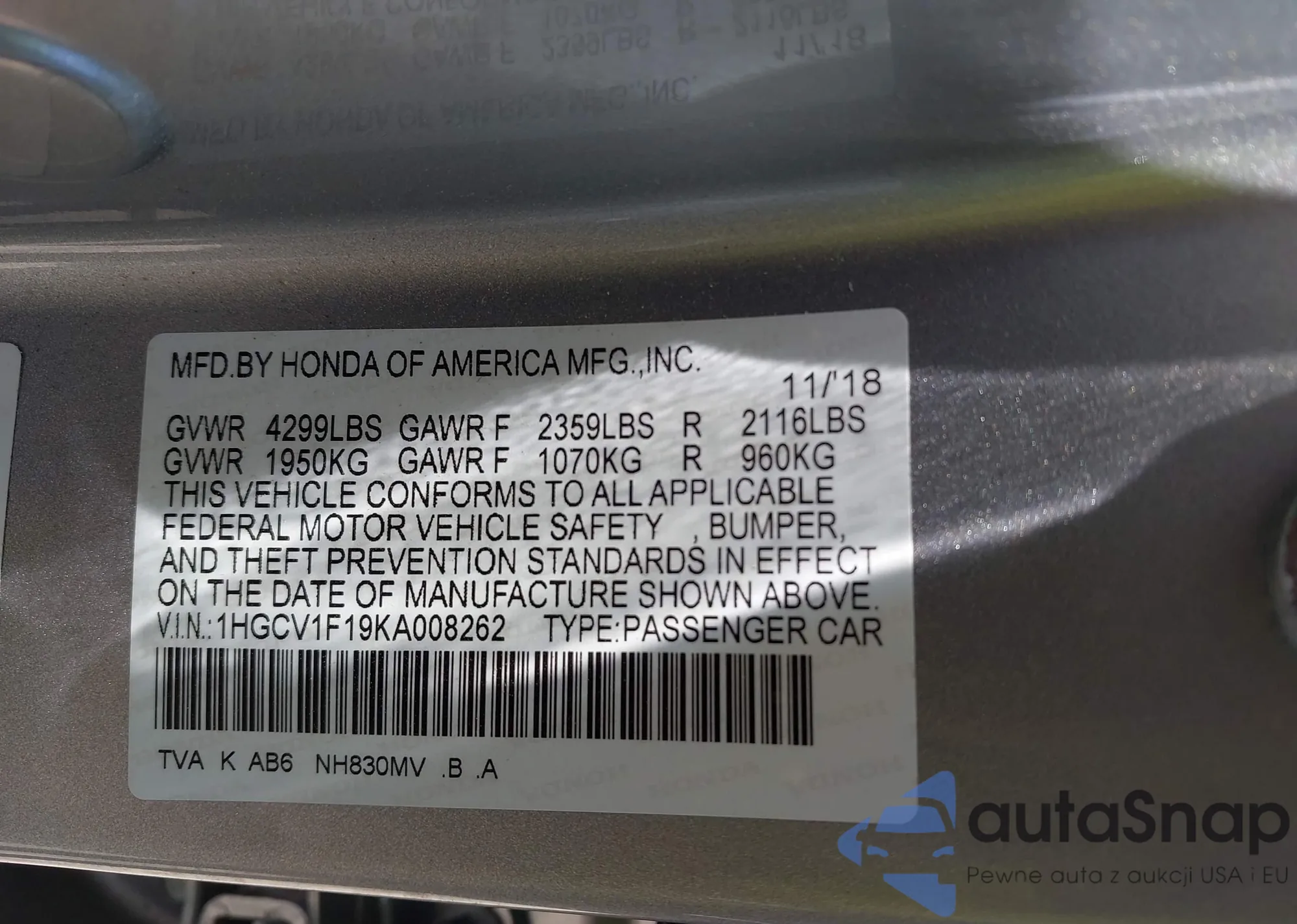LOT: 42326916 VIN: 1HGCV1F19KA008262