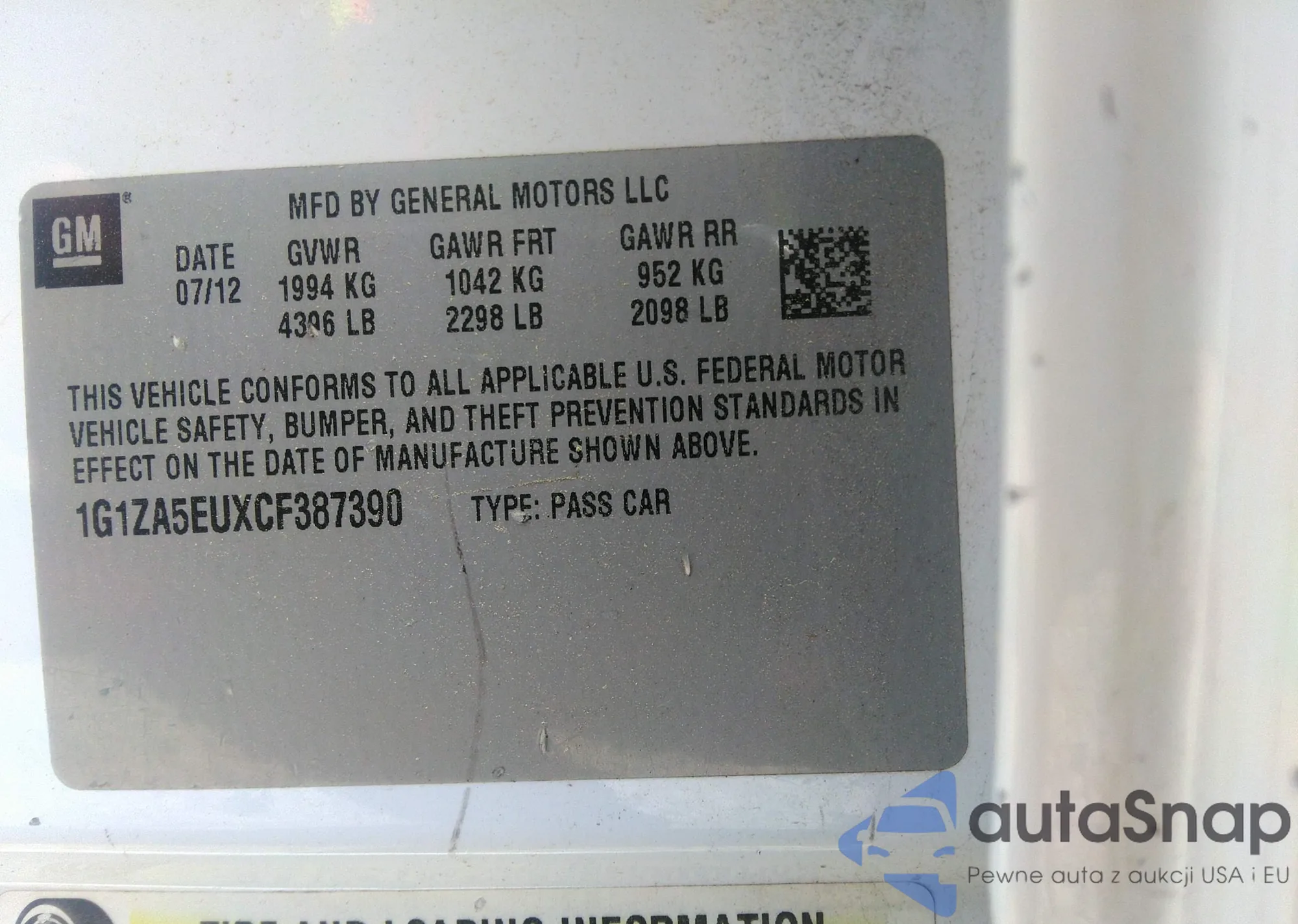 • VIN 1G1ZA5EUXCF387390