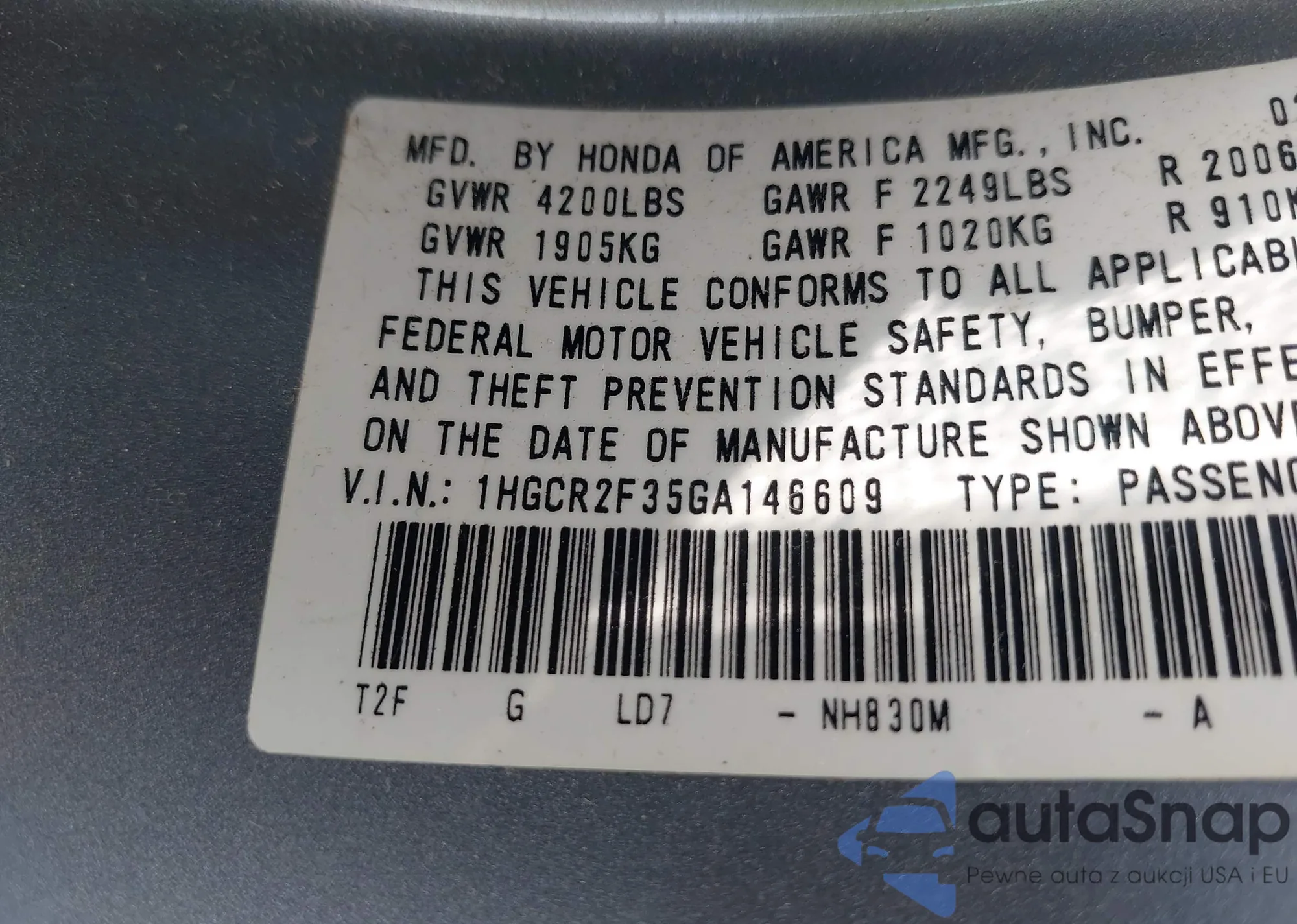 • VIN 1HGCR2F35GA146609