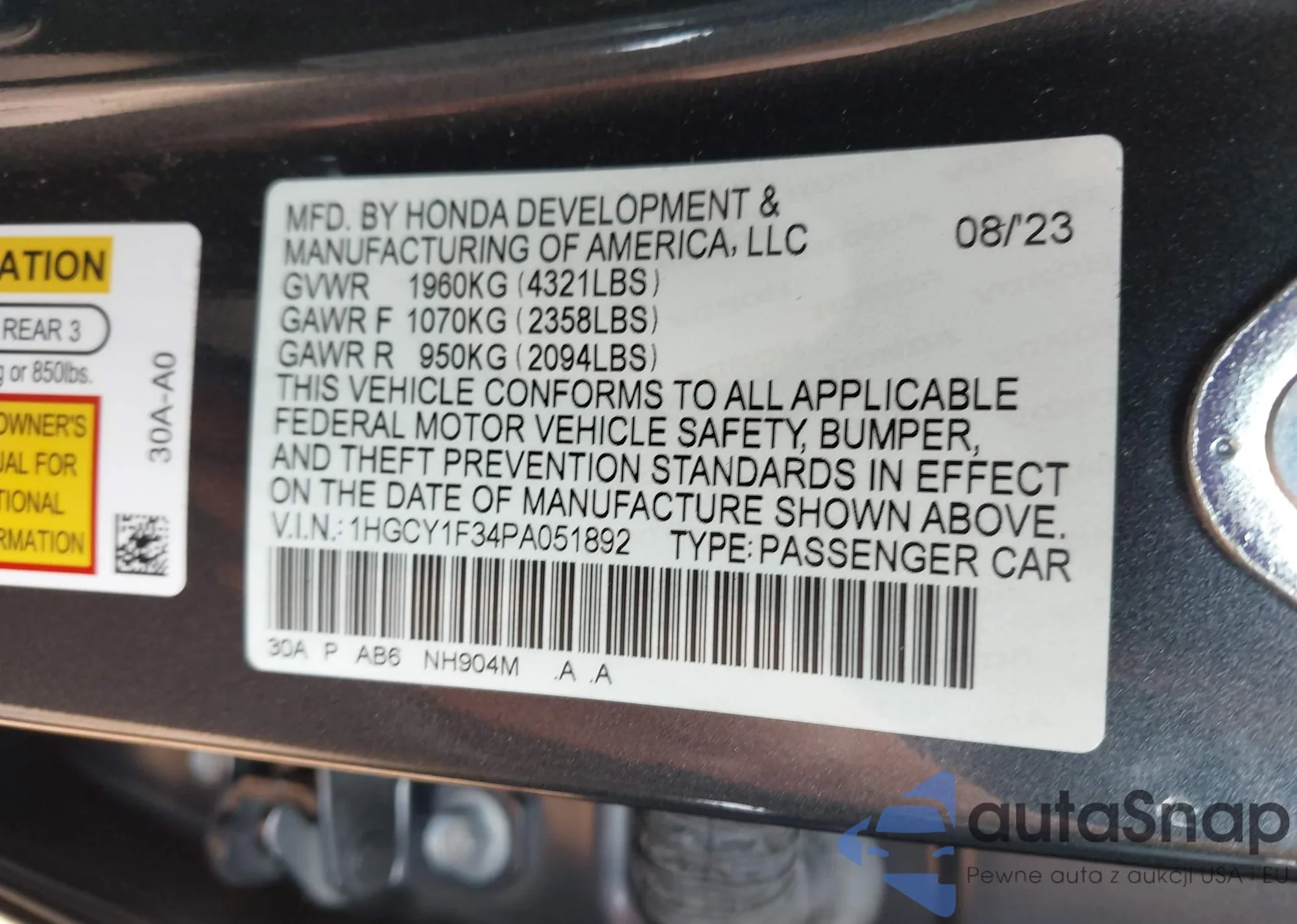 • VIN 1HGCY1F34PA051892