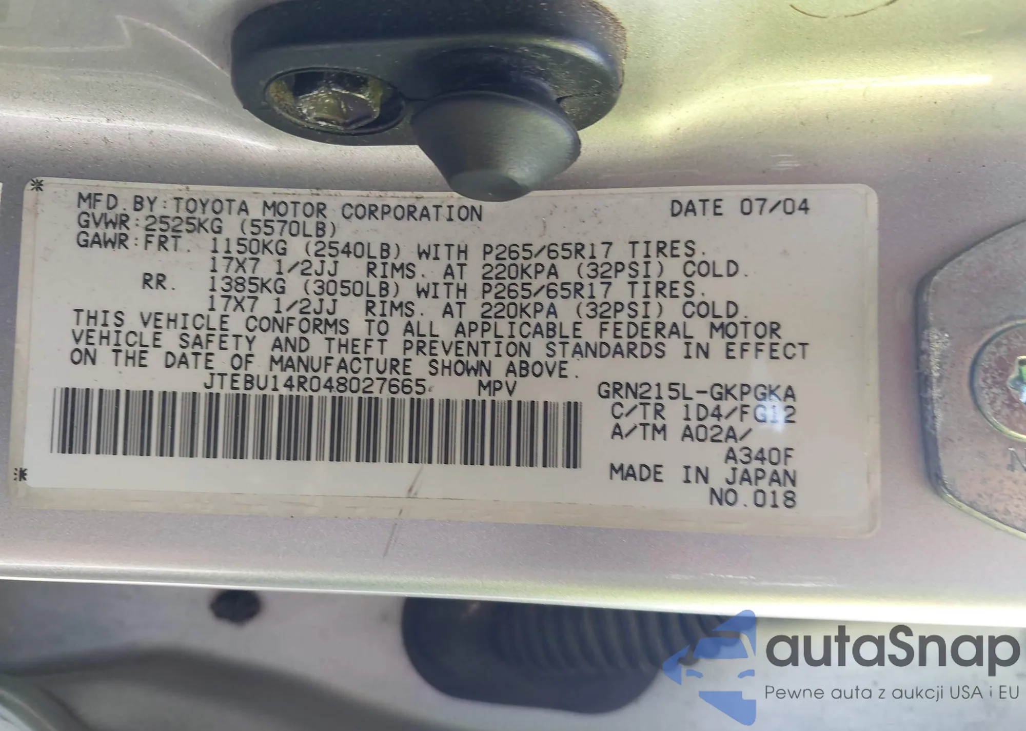 LOT: 42490985 VIN: JTEBU14R048027665