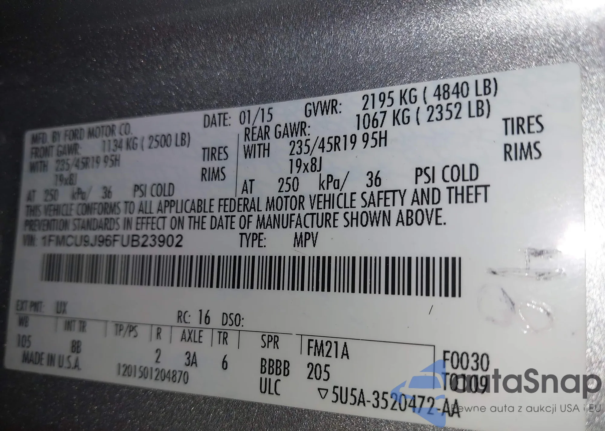 LOT: 42497188 VIN: 1FMCU9J96FUB23902