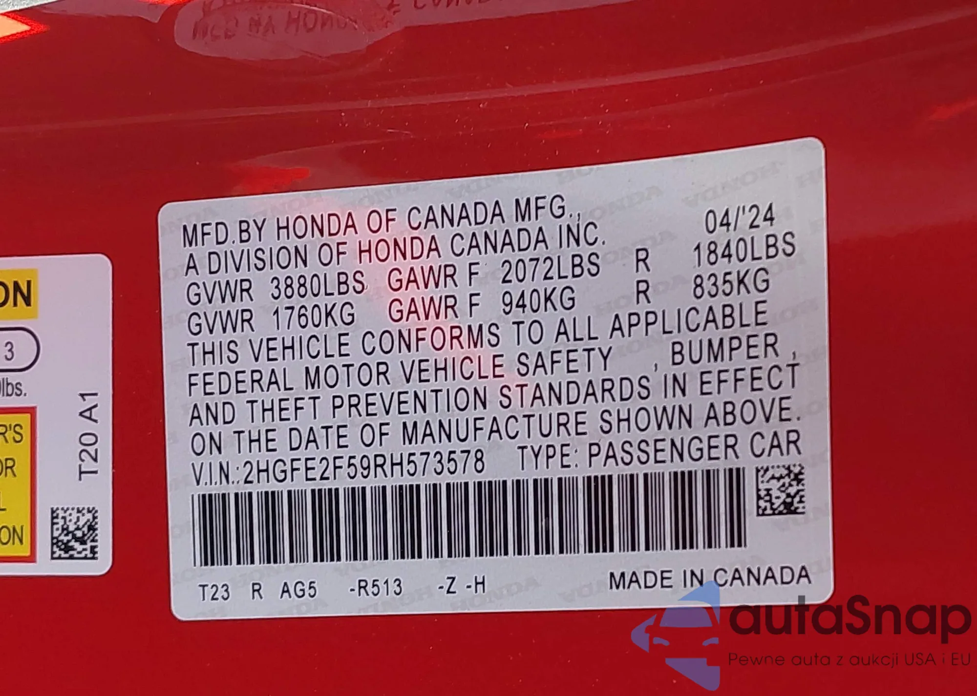 LOT: 42134366 VIN: 2HGFE2F59RH573578