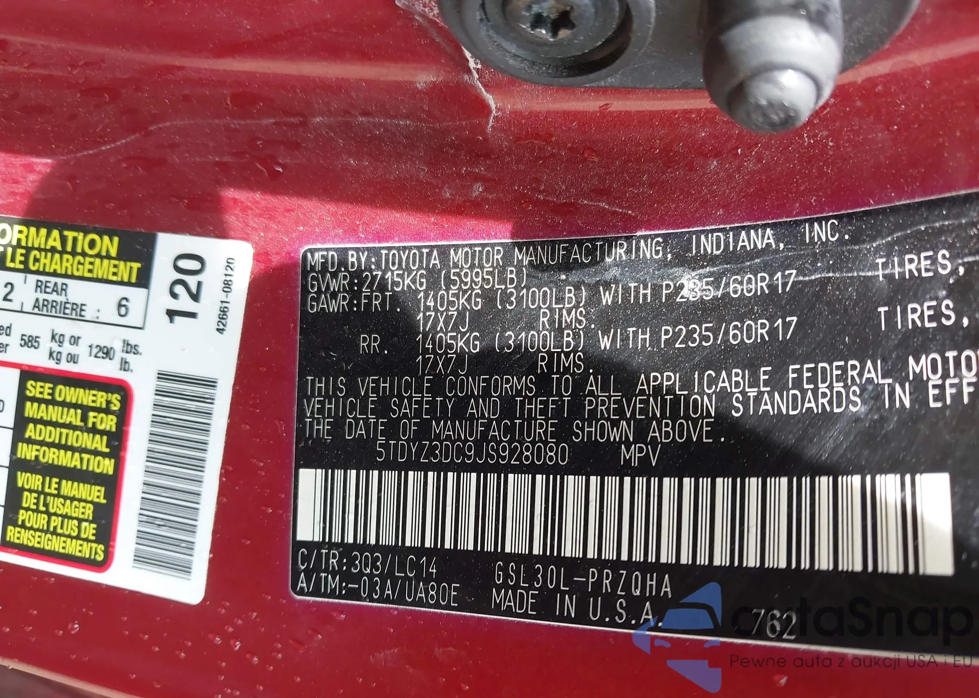 • VIN 5TDYZ3DC9JS928080
