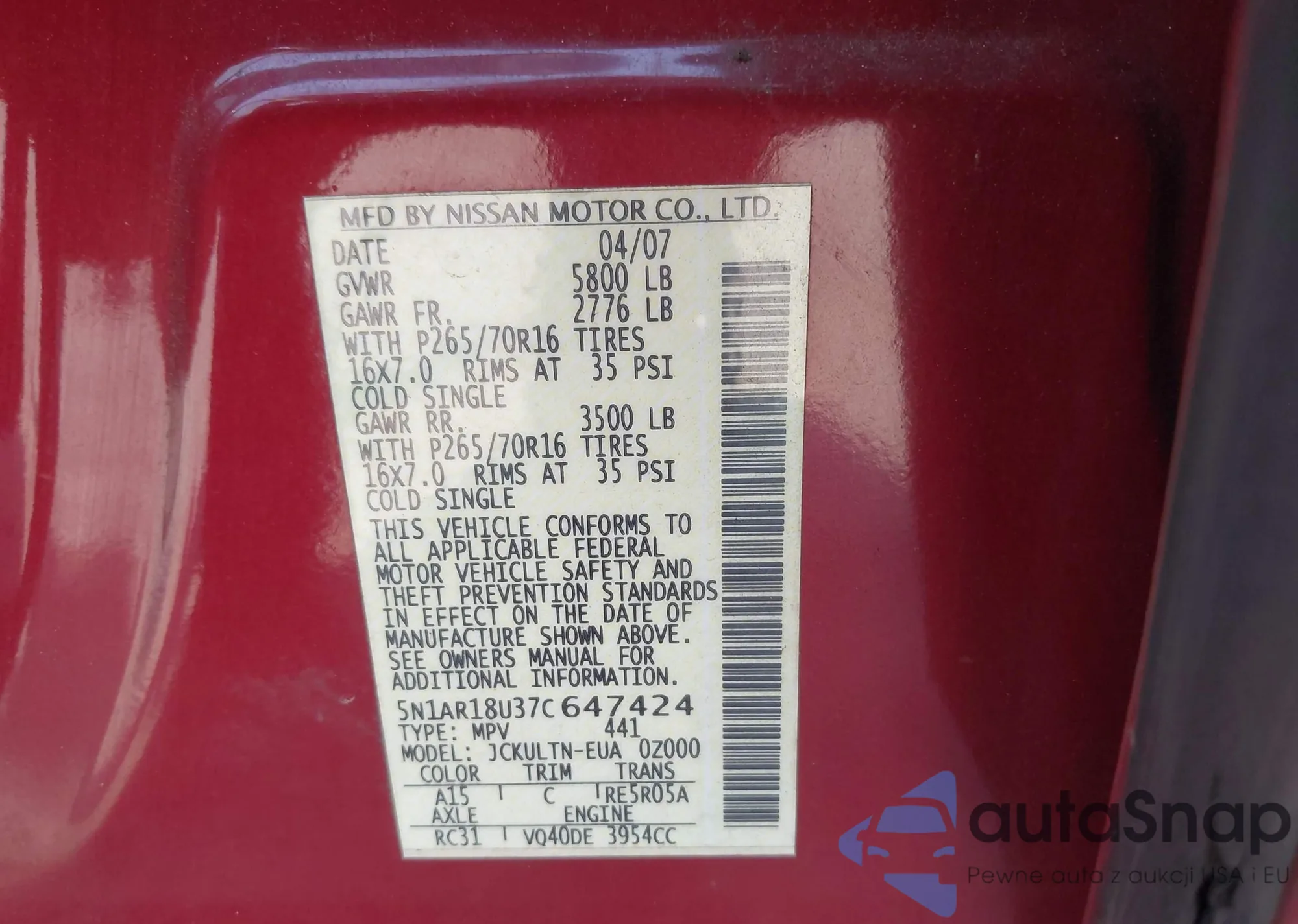 • VIN 5N1AR18U37C647424