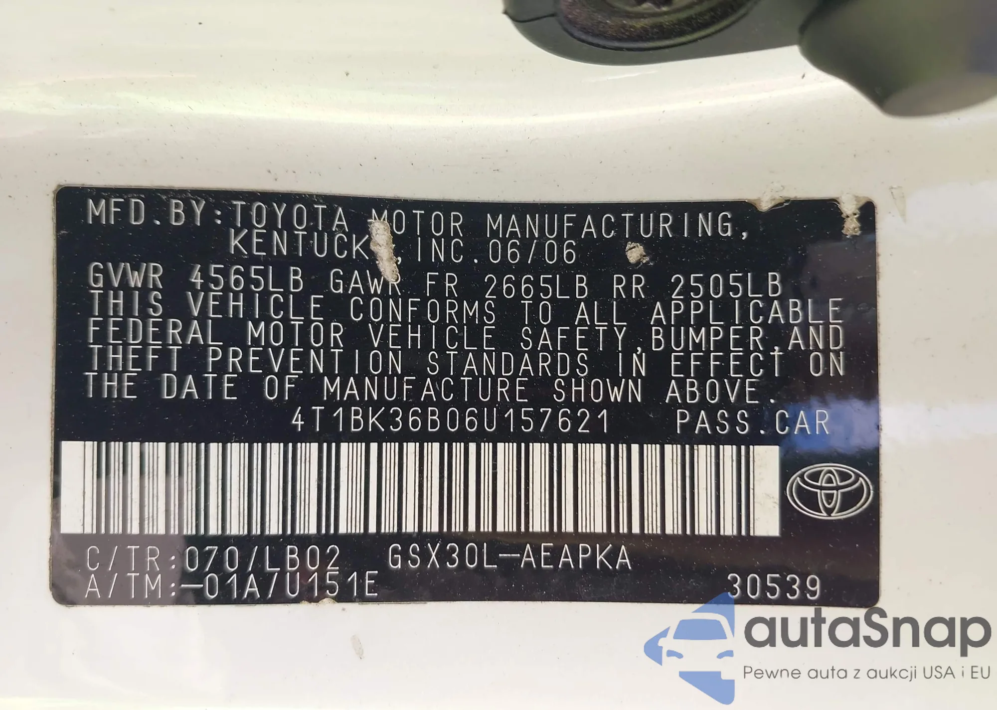 LOT: 42312985 VIN: 4T1BK36B06U157621