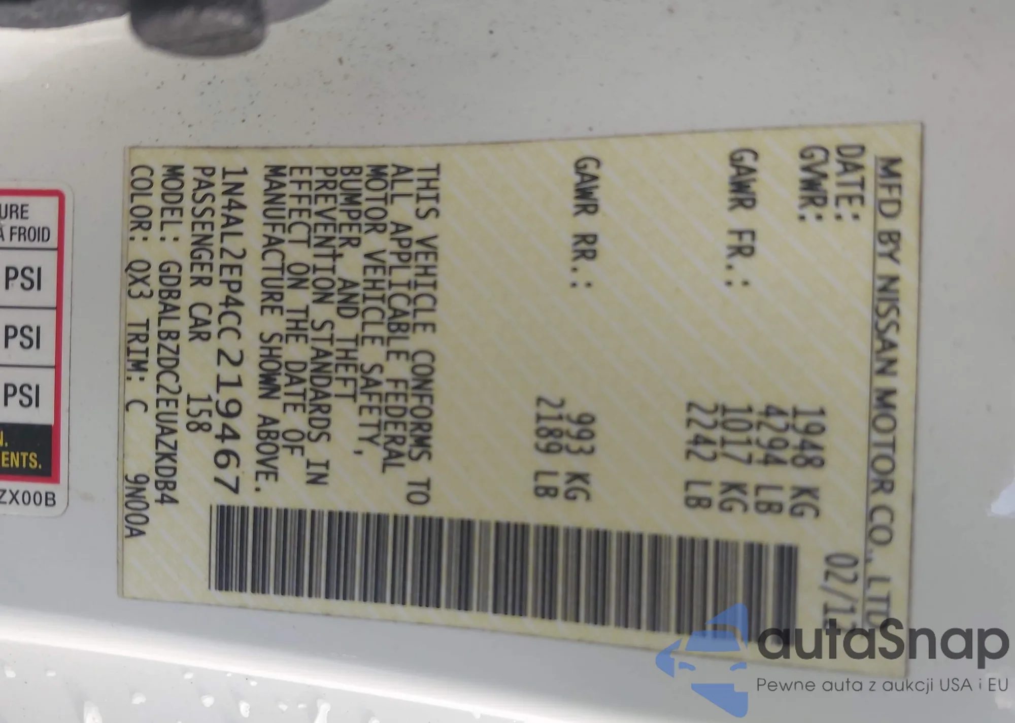 LOT: 42568679 VIN: 1N4AL2EP4CC219467