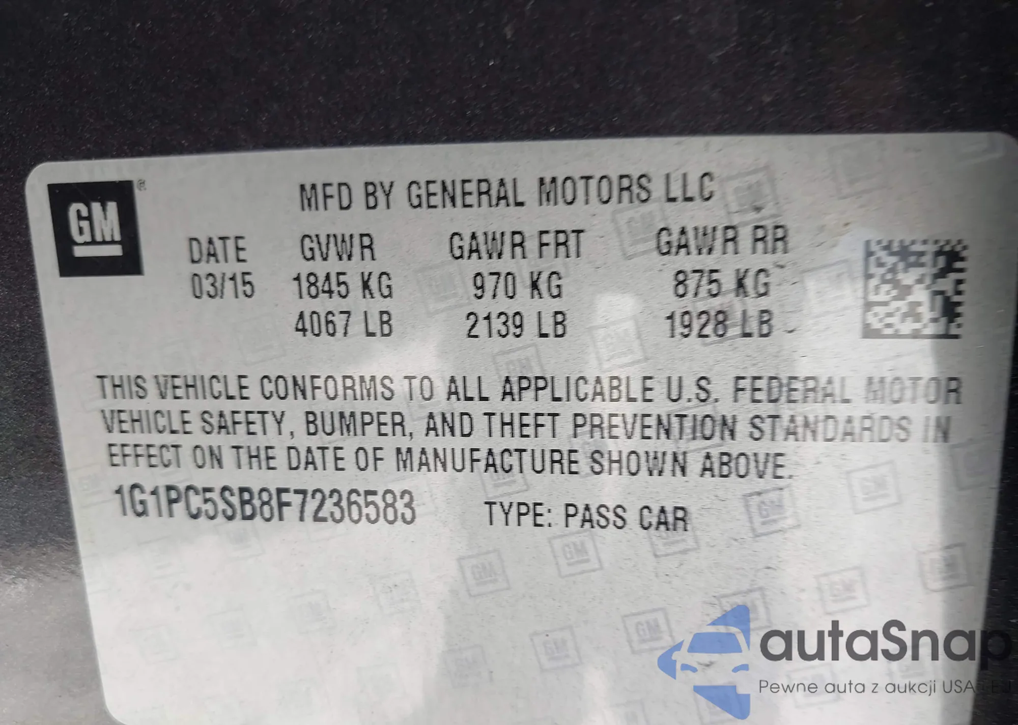 LOT: 42539405 VIN: 1G1PC5SB8F7236583