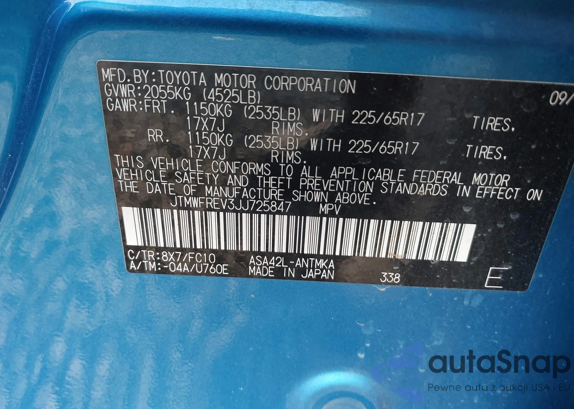 LOT: 42110555 VIN: JTMWFREV3JJ725847