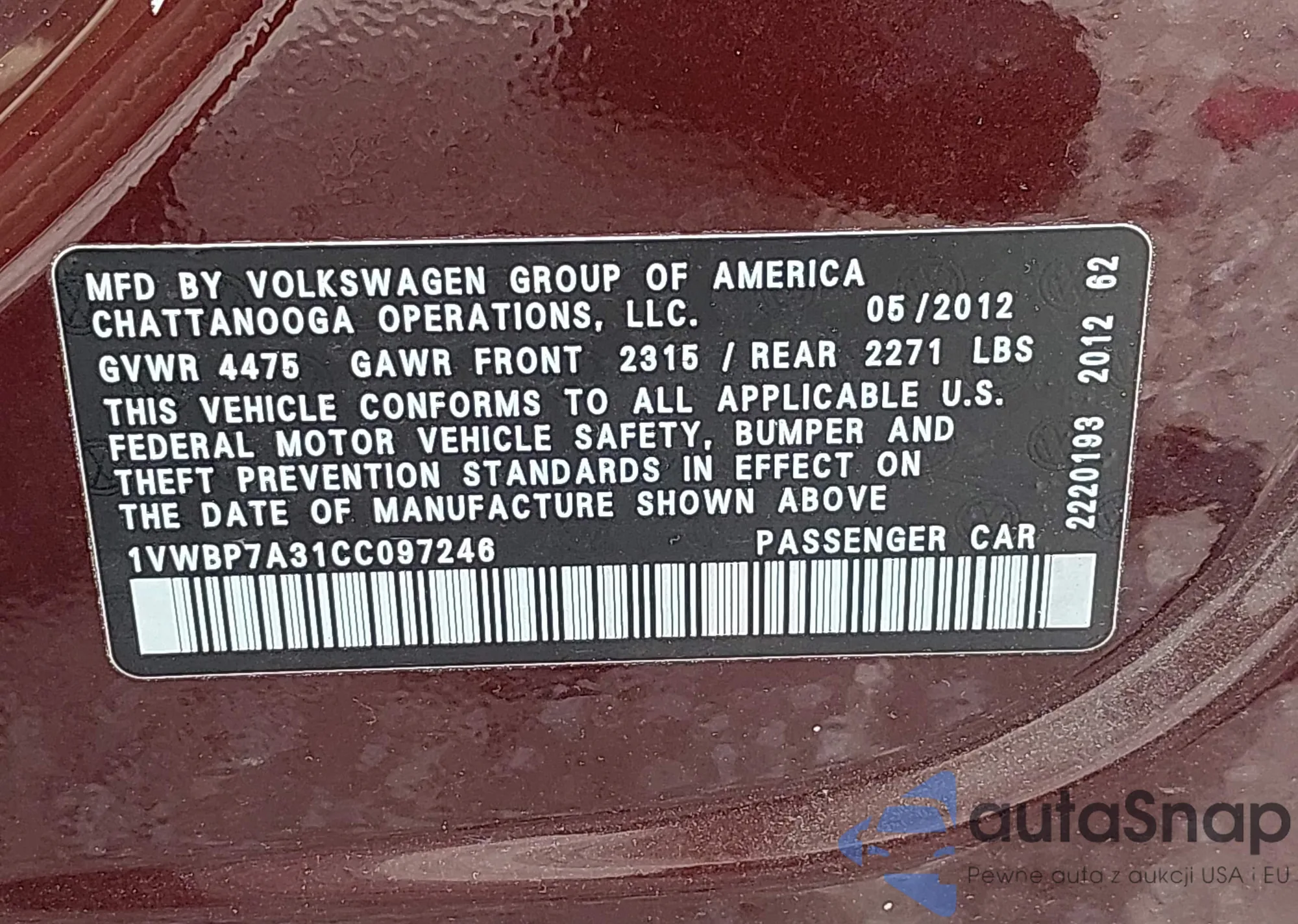 • VIN 1VWBP7A31CC097246