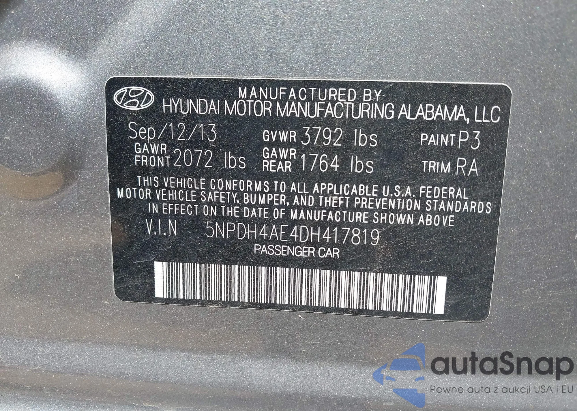 LOT: 42163626 VIN: 5NPDH4AE4DH417819
