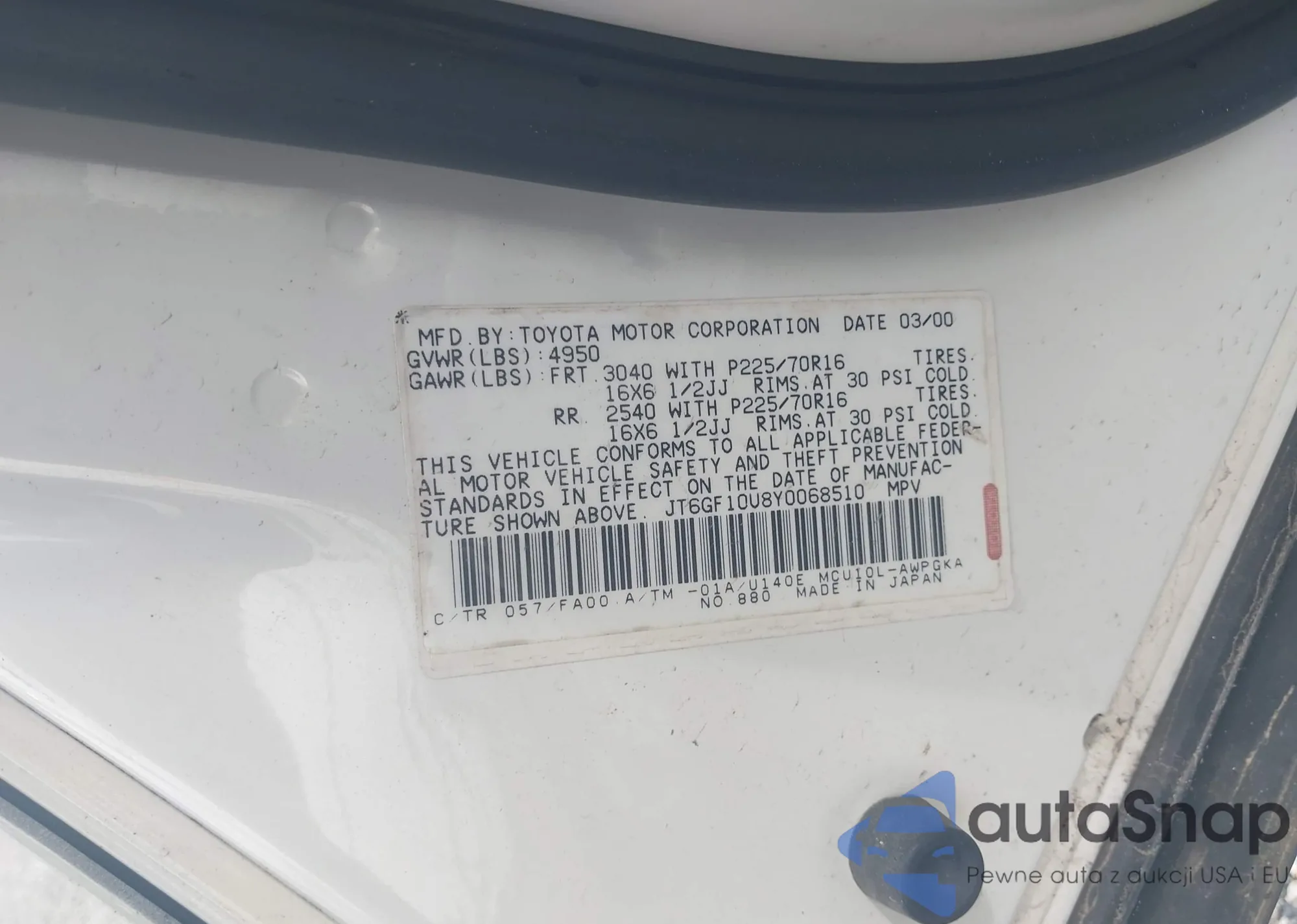 LOT: 42346083 VIN: JT6GF10U8Y0068510