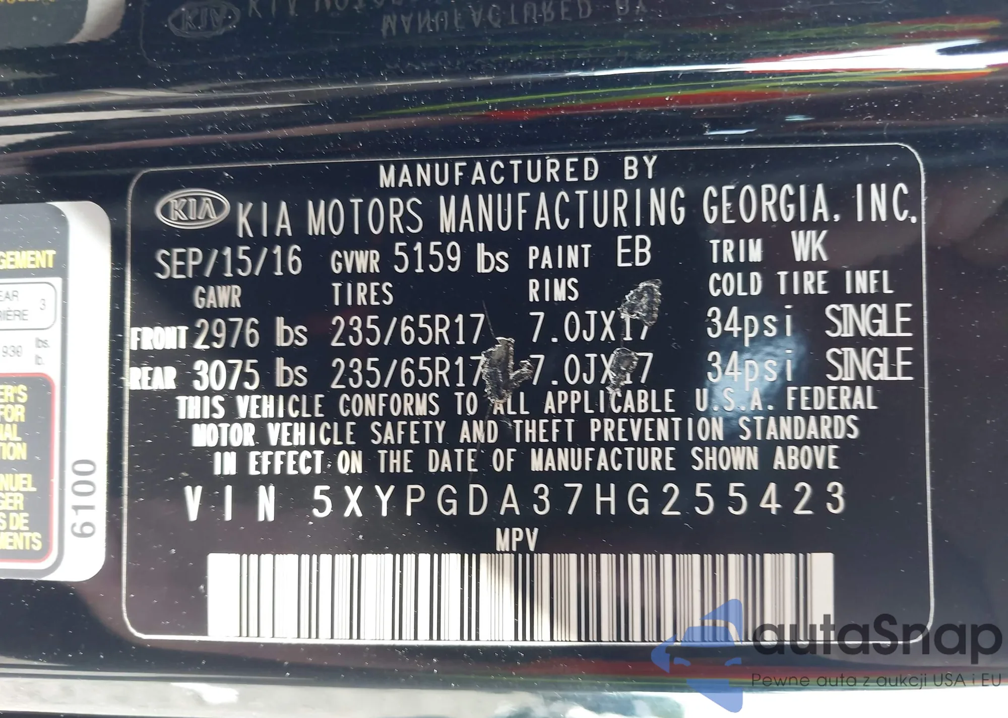 LOT: 42386708 VIN: 5XYPGDA37HG255423