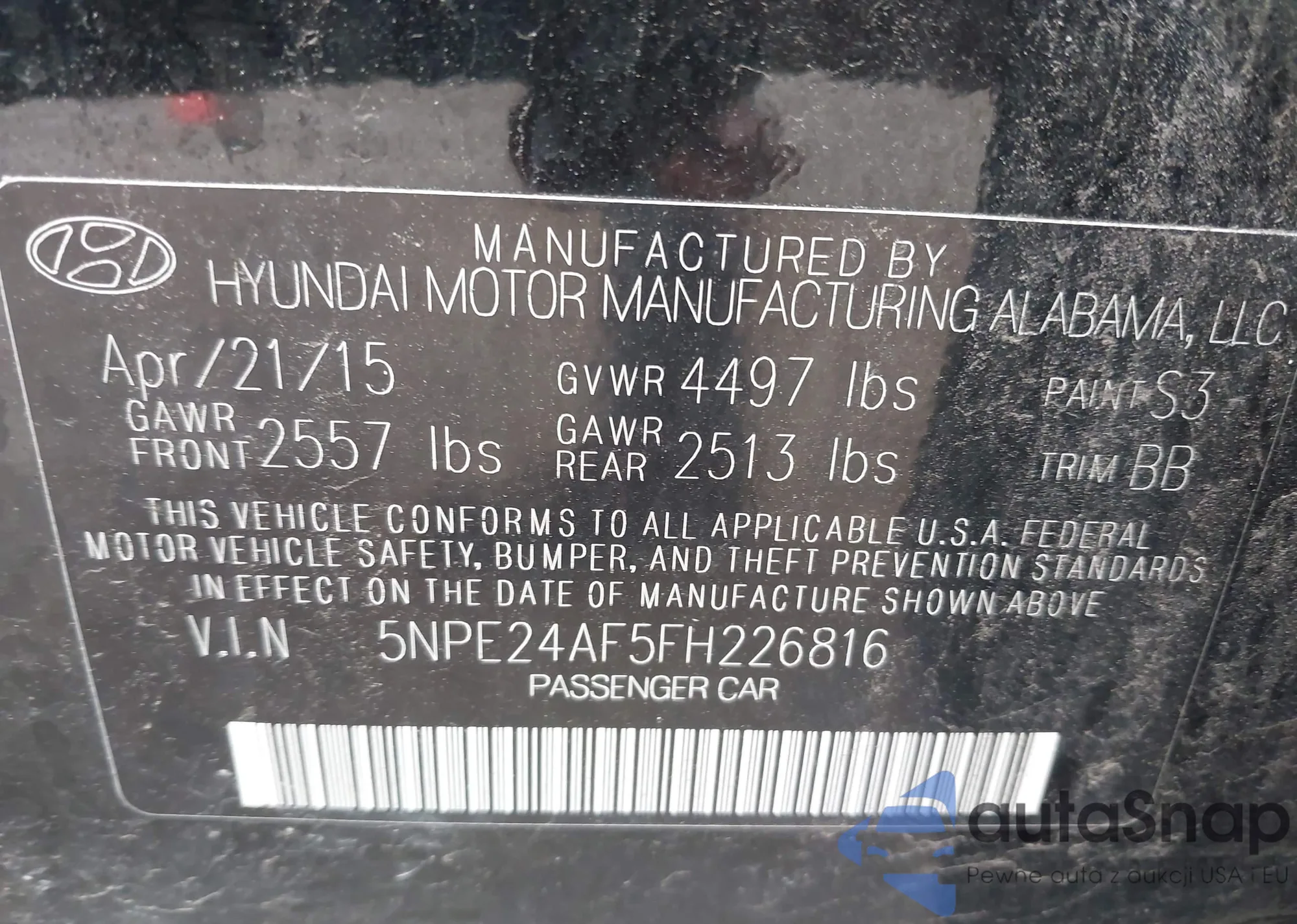 • VIN 5NPE24AF5FH226816