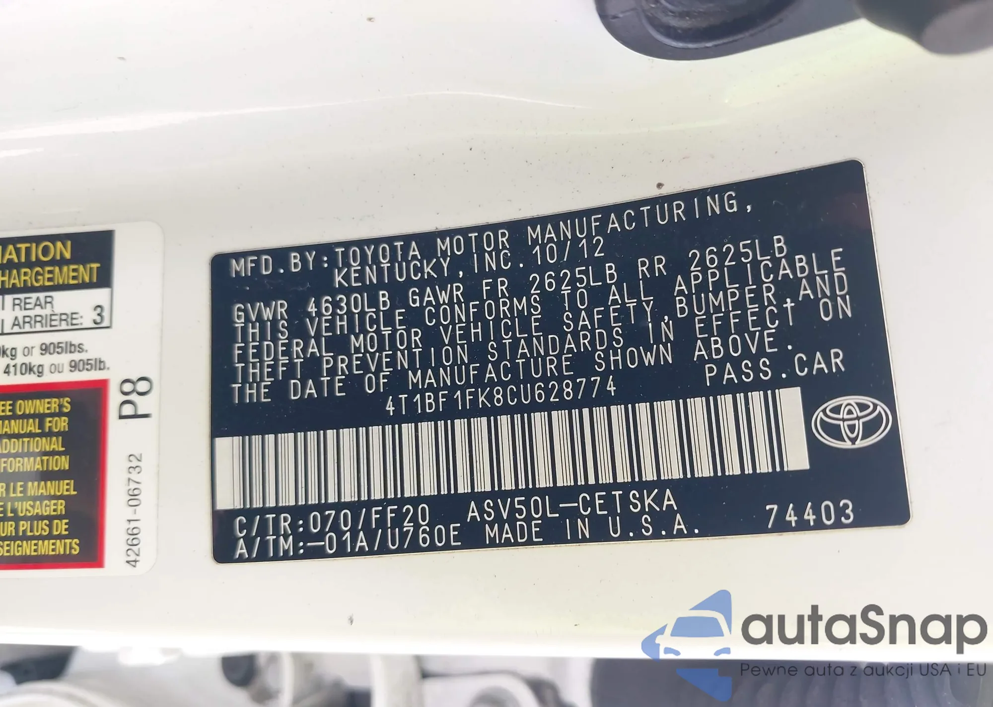 • VIN 4T1BF1FK8CU628774