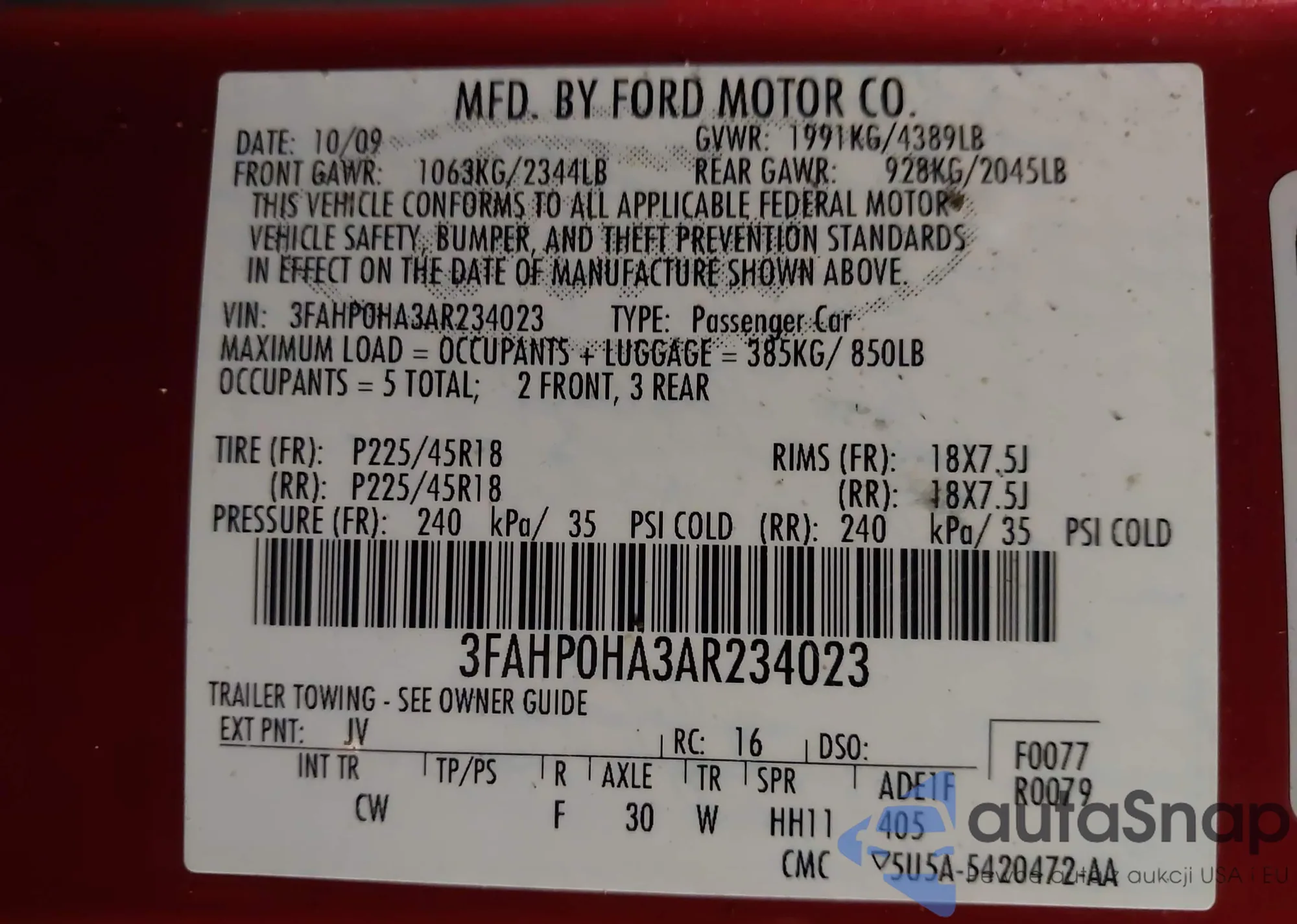 LOT: 42493727 VIN: 3FAHP0HA3AR234023