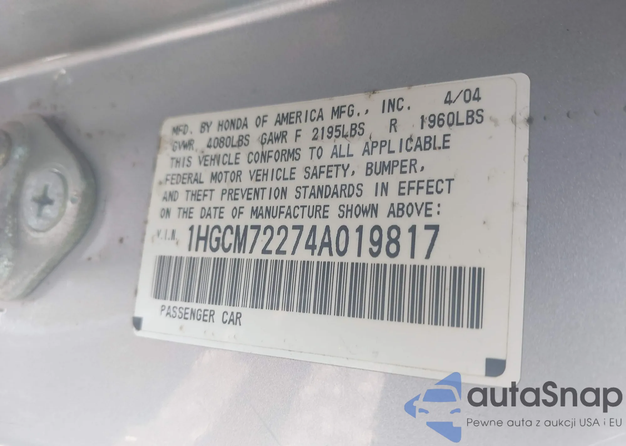 LOT: 42546717 VIN: 1HGCM72274A019817