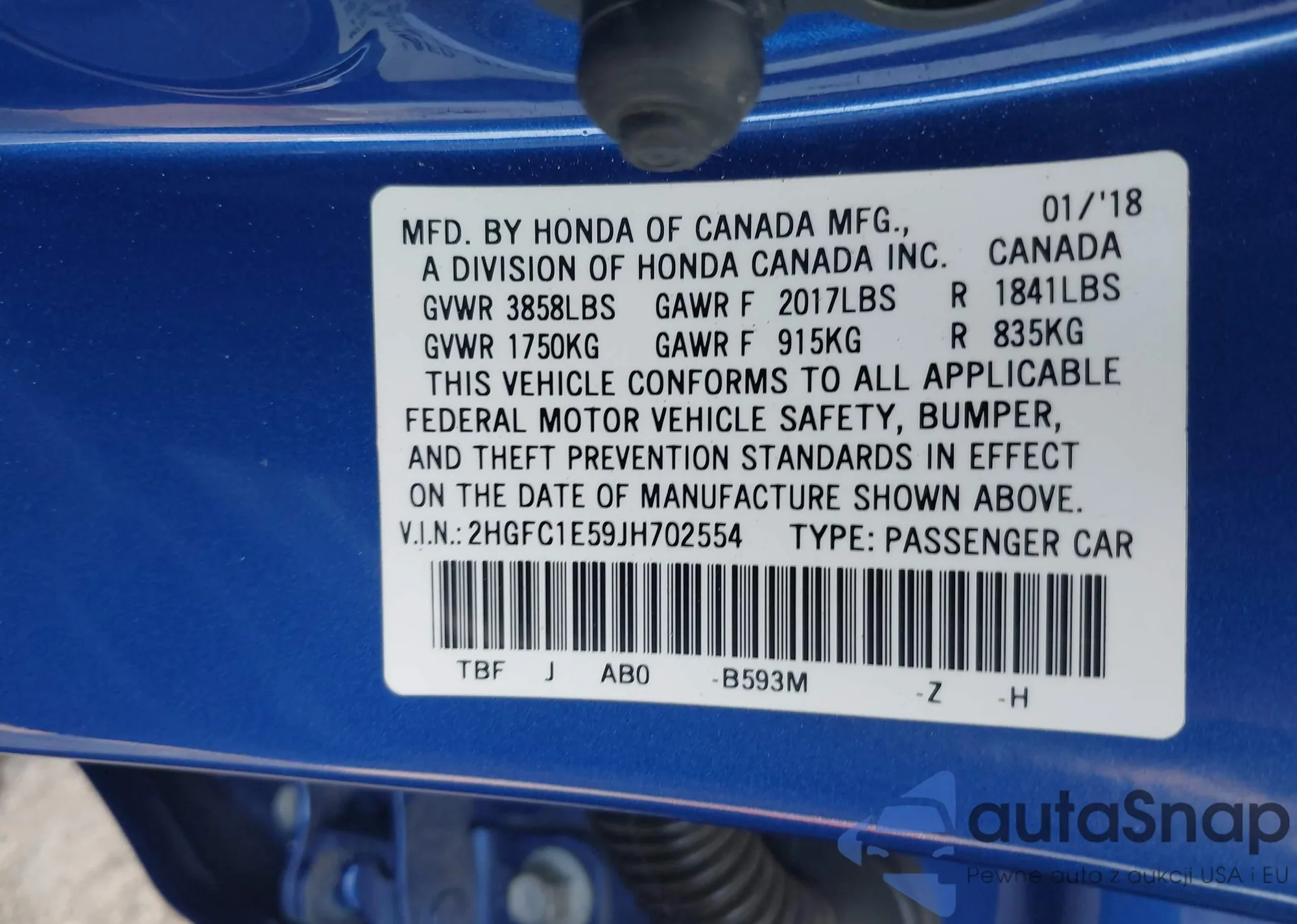 • VIN 2HGFC1E59JH702554
