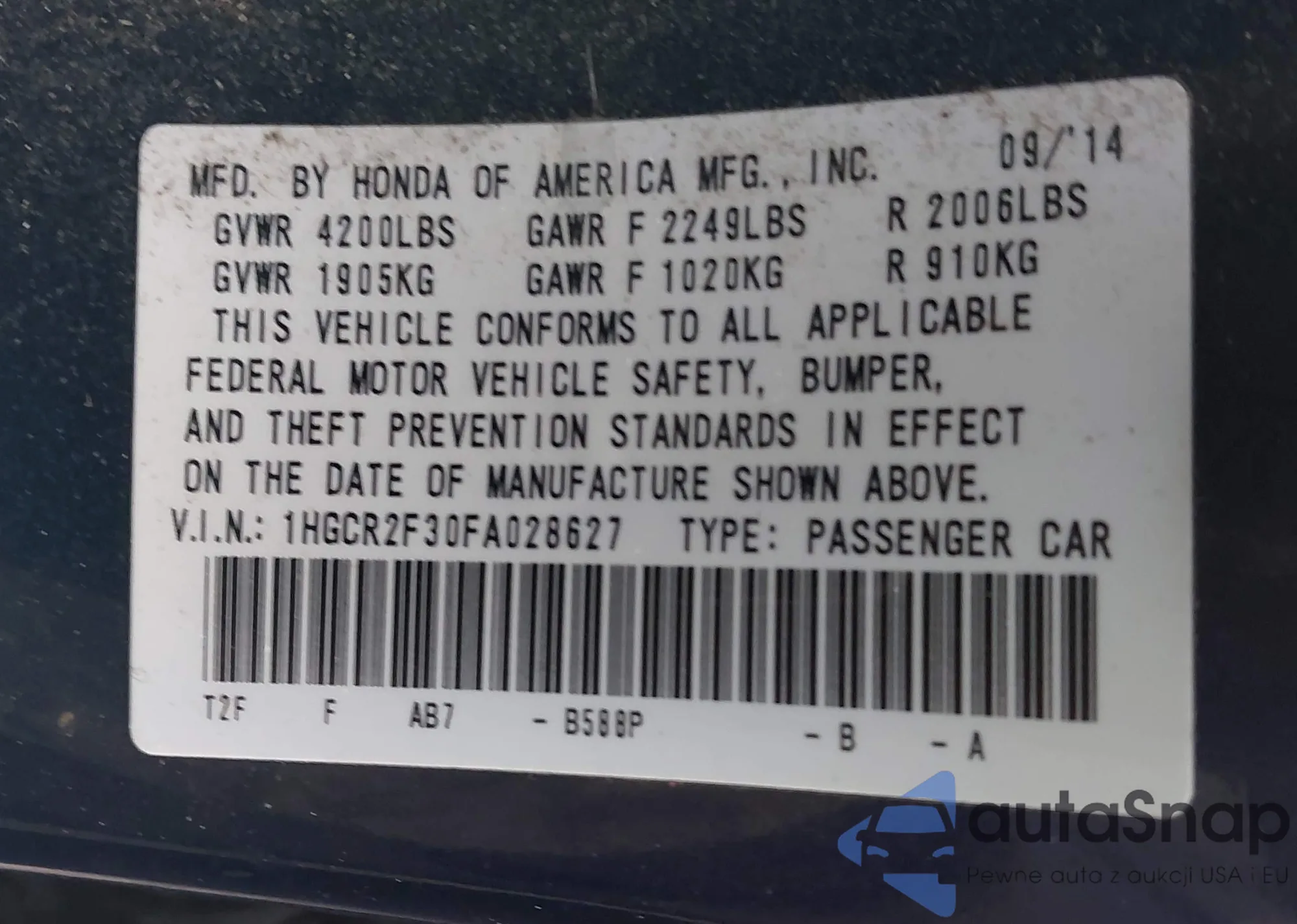 LOT: 41411801 VIN: 1HGCR2F30FA028627