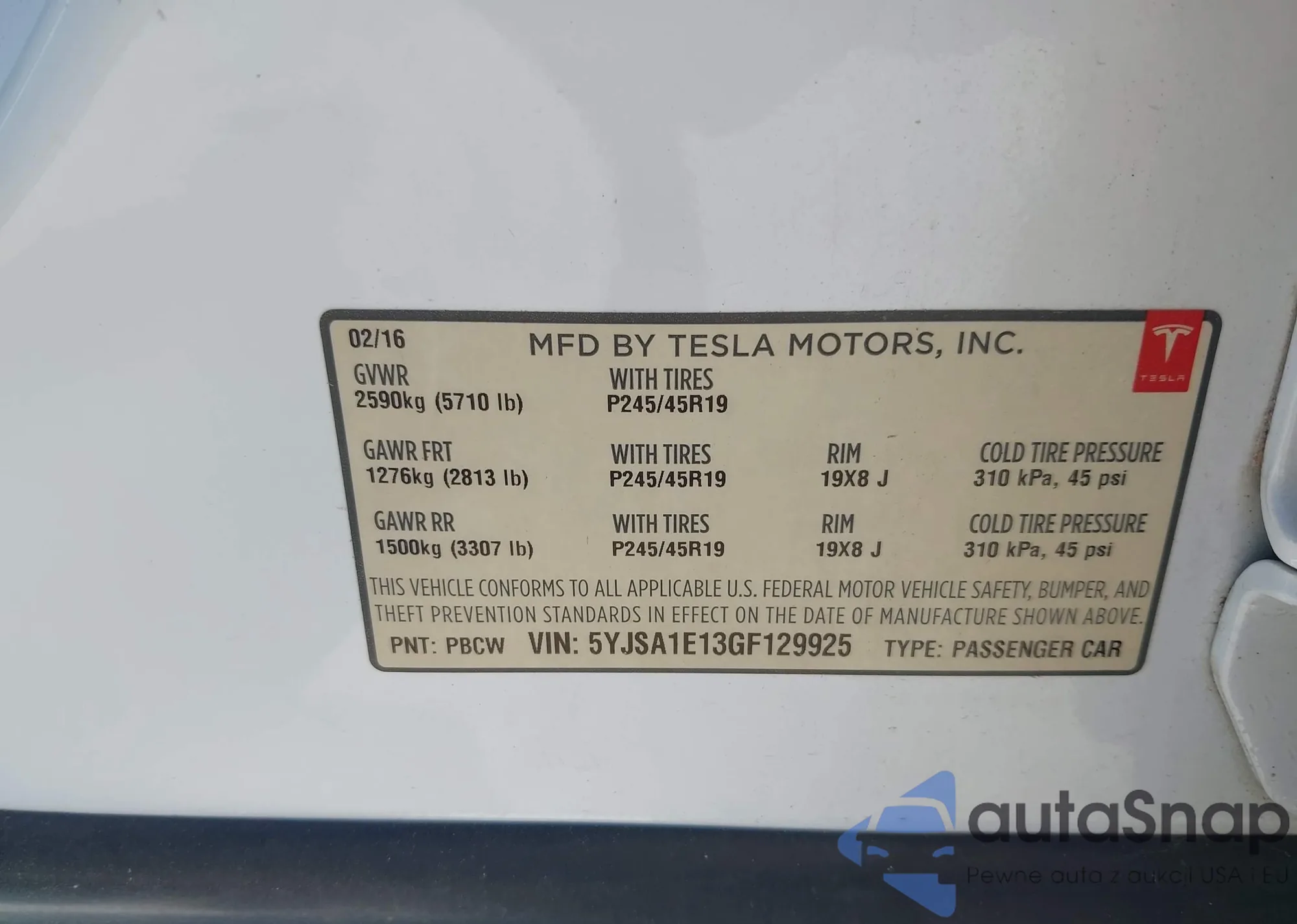 • VIN 5YJSA1E13GF129925