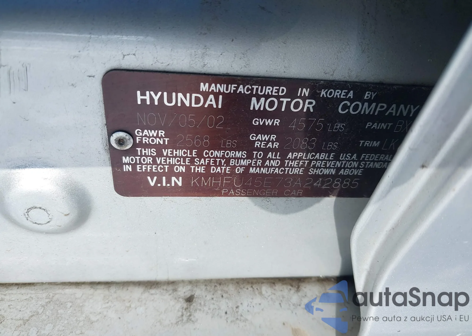 LOT: 41367328 VIN: KMHFU45E73A242885