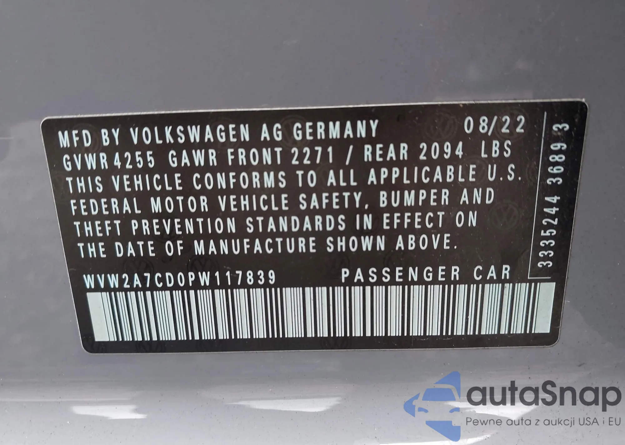 • VIN WVW2A7CD0PW117839