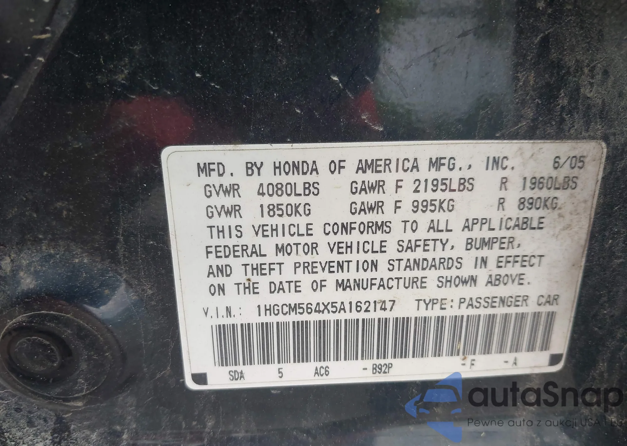 LOT: 42539348 VIN: 1HGCM564X5A162147