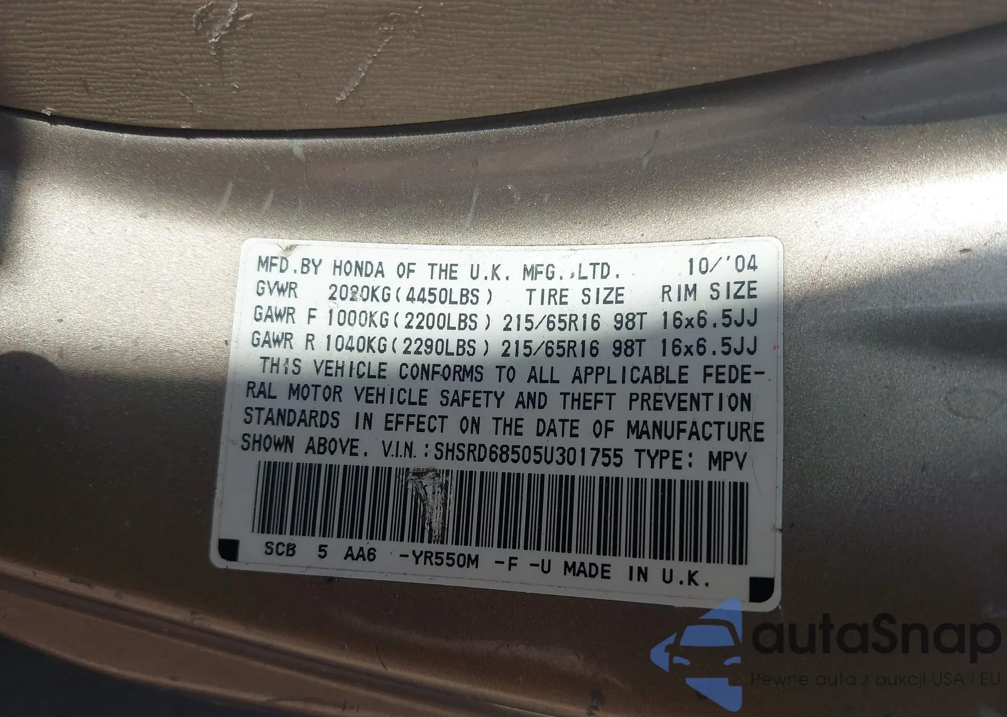 LOT: 42617521 VIN: SHSRD68505U301755