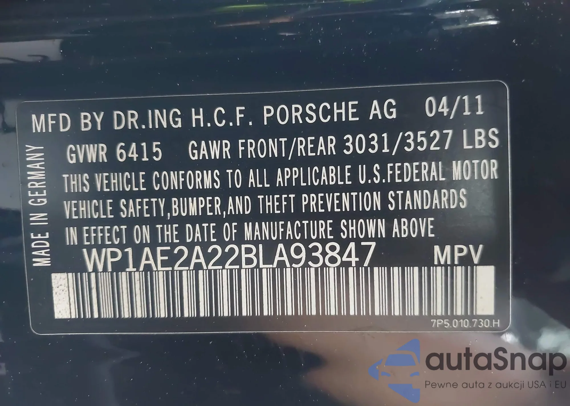 LOT: 42507754 VIN: WP1AE2A22BLA93847