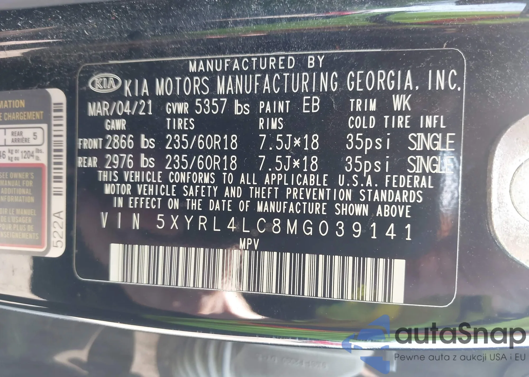 • VIN 5XYRL4LC8MG039141