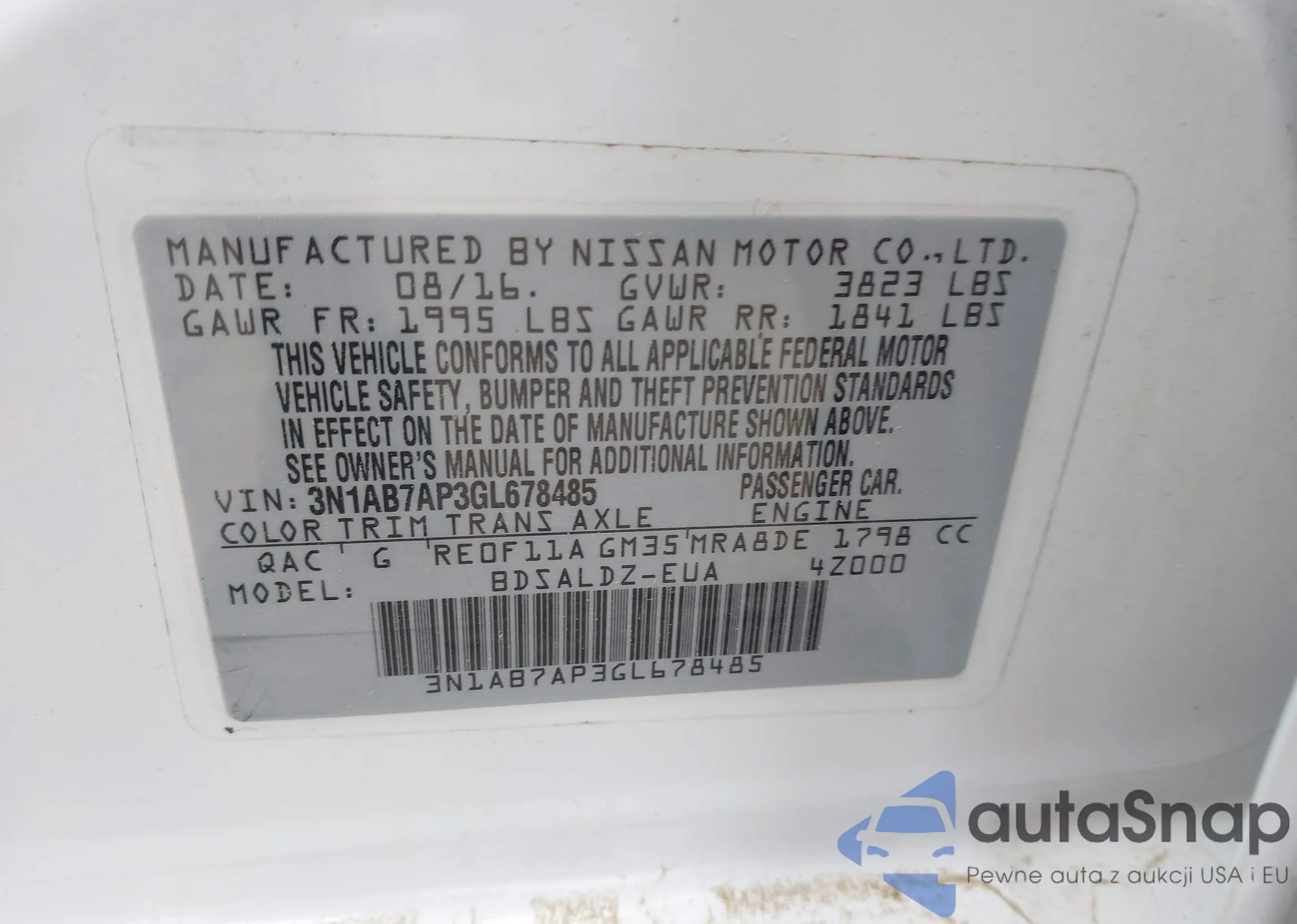 LOT: 42540584 VIN: 3N1AB7AP3GL678485