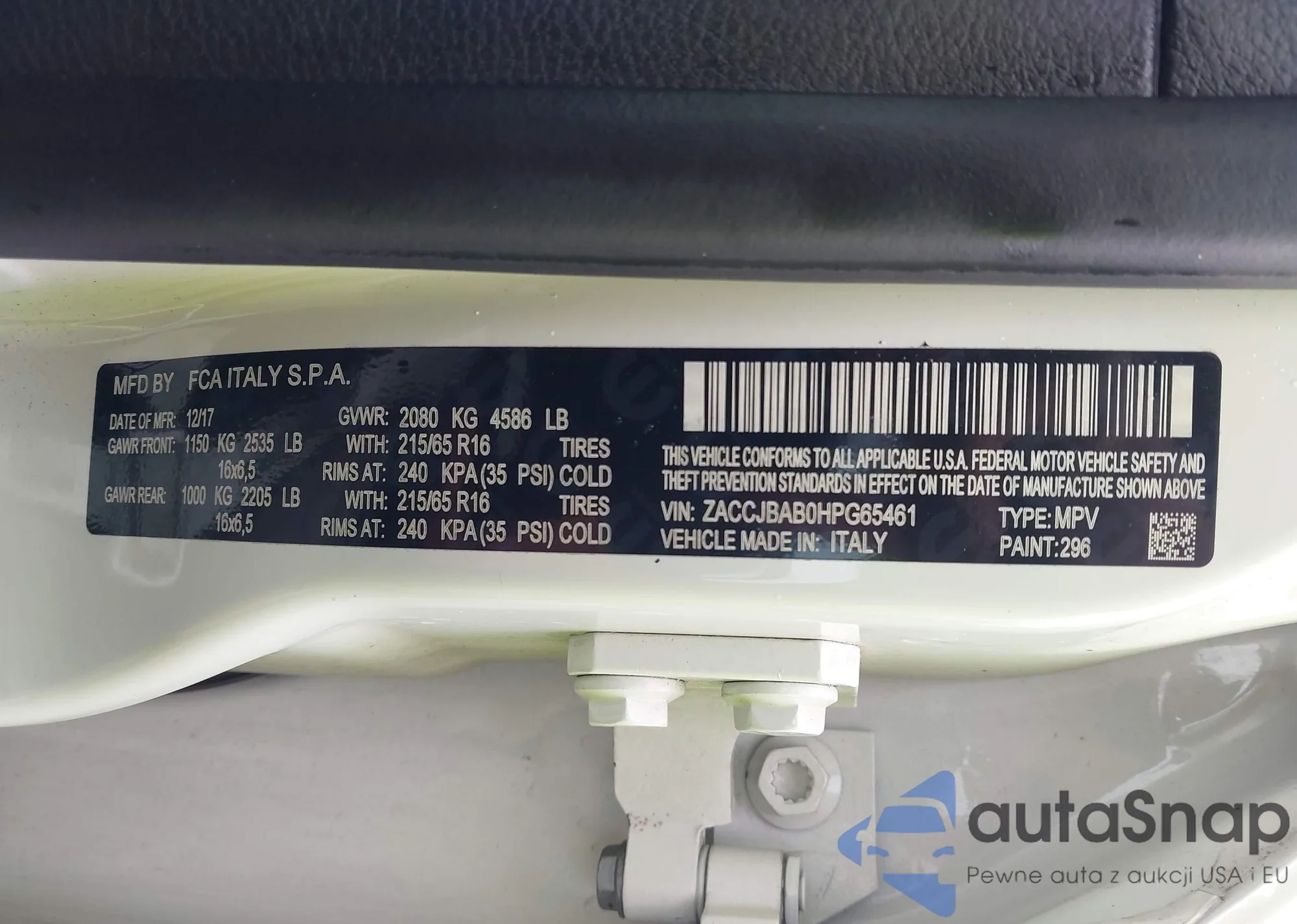 LOT: 42622815 VIN: ZACCJBAB0HPG65461